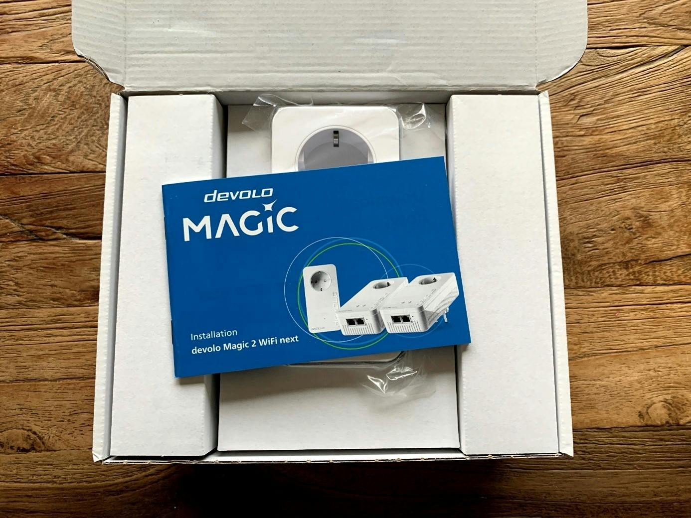 De Devolo Magic 2 komt in een keurige verpakking die eenvoudig te openen is. Deze verpakking bevat een instructieboekje. Het basisstation en twee wifi-extenders. Daarnaast zit er nog een LAN-kabel in om het basisstation op de router aan te sluiten.