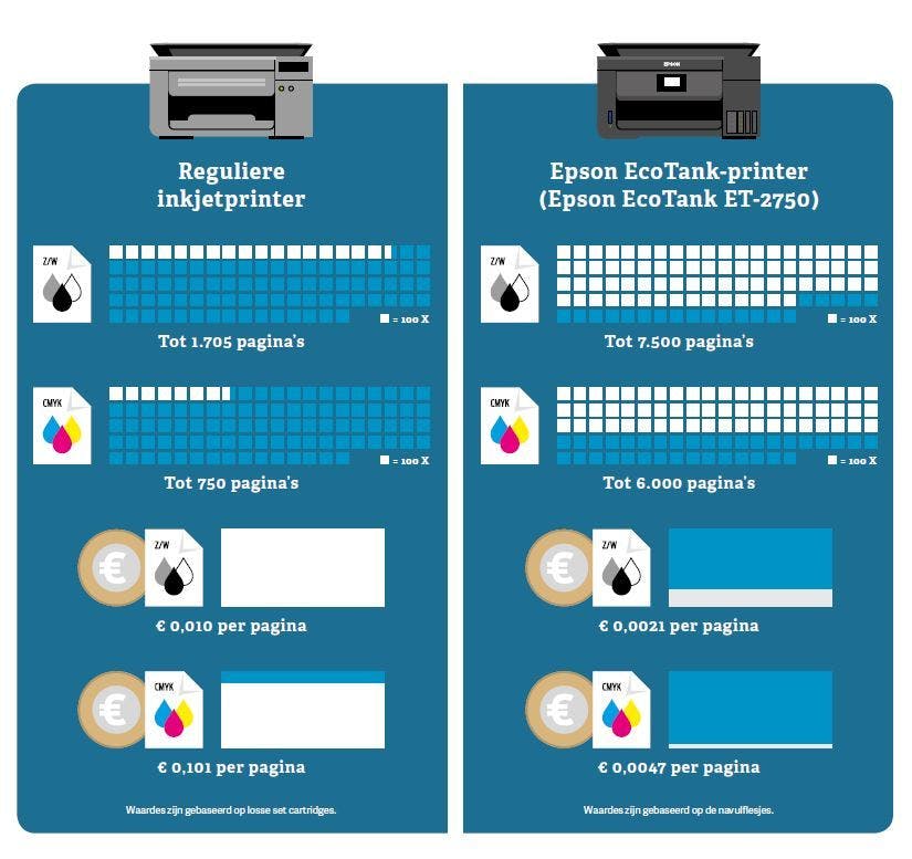 Komt je printer álweer met een irritante inktniveau- waarschuwing? Zzp’ers hebben het al druk genoeg en het vervangen van een inktcartridge komt bijna altijd op een ongelegen moment. Bovendien dien je continu voldoende inktpatronen achter de hand te houden. Epson gooit het met zijn EcoTank-serie over een andere boeg. Deze luxe printers laten cartridges volledig links liggen. In plaats daarvan gebruik je navulbare inkttanks waarbij je het werkelijke inktniveau letterlijk op de behuizing kunt aflezen. Het resultaat? Een capaciteit van duizenden pagina’s per inktset, waarmee je tot negentig procent op je inktkosten bespaart. Je hoeft slechts sporadisch inkt bij te vullen, waardoor je vergeleken met verwisselbare cartridges aanmerkelijk goedkoper uit bent. De prijs per pagina is dan ook schrikbarend laag!