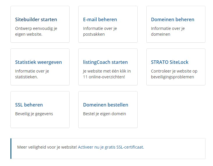 Nadat je een webhostingpakket hebt aangevraagd bij Strato.nl, ontvang je een e-mail met daarin je inloggegevens en een link naar je account. Klik op de link en log in op je account. Je krijgt nu een overzicht van de mogelijkheden. Klik op Sitebuilder starten om te beginnen met het maken van je website.