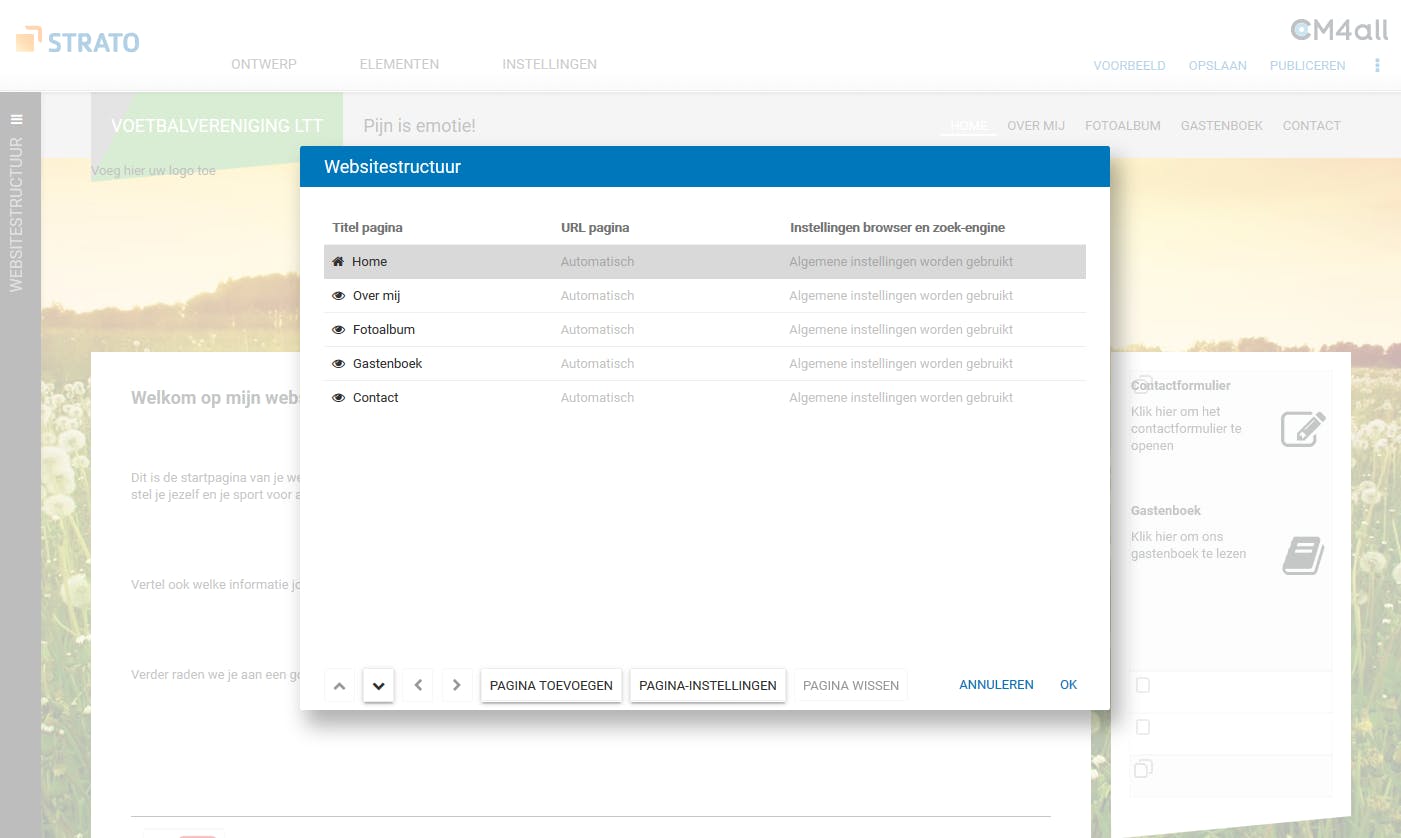 Een website bestaat (meestal) uiteraard niet uit alleen een voorpagina. Het is een pagina die verwijst naar allerlei subpagina’s. Standaard heeft Sitebuilder een aantal subpagina’s voor je gemaakt. Door links op Websitestructuur te klikken zie je precies welke pagina’s er zijn. De pagina’s in dit overzicht komen overeen met het navigatiemenu op je pagina. Klik op Bewerken om de websitestructuur aan te passen. Je kunt dan bijvoorbeeld pagina’s wijzigen (titel aanpassen), verwijderen of toevoegen. Pagina’s die je toevoegt, komen automatisch in je navigatiemenu te staan –wel zo makkelijk! Let bij het toevoegen van een pagina goed op dat je de velden Browsertitel, Beschrijving en Trefwoorden goed invult, dit is belangrijk voor je vindbaarheid binnen Google.