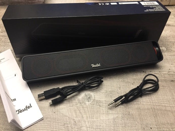 De verpakking ziet en voelt solide aan en straalt kwaliteit uit. Bij het openen van de doos zie je meteen de Teufel Bamster. Deze is wat groter dan ik verwachte bij een portable bluetooth speaker. Je stopt hem niet even snel in je jaszak. Toch ben ik blij verrast. De Teufel Bamster ziet er strak vormgegeven uit. Deze afwerking zorgt er wel voor dat ik meteen besluit de Teufel Bamster indoors te testen en niet mee te nemen naar natte dampige sportvelden.