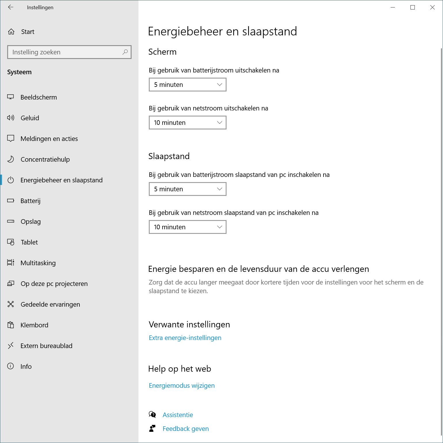 Ook in Windows 10 is veel aandacht besteed aan het op een slimme manier omgaan met energie. Het besturingssysteem is geoptimaliseerd voor gebruik met een batterij en geeft je als gebruiker ook controle over de balans tussen prestaties en energieverbruik. Klik in de Windows-taakbalk op het pictogram van de batterij. Je opent hiermee een venster waarin je met een schuifregelaar kunt kiezen tussen de langste levensduur van de batterij of de beste prestaties. Je kunt ook kiezen voor modi die zich tussen deze twee uitersten bevinden, waardoor je volledige controle hebt over het energieverbruik. Bovendien kun je slim gebruik maken van energiebeheerschema’s. Dit is een verzameling hardware- en systeeminstellingen waarmee je het energieverbruik onder controle houdt. Klik met de rechtermuisknop op het pictogram van de batterij en kies Energiebeheer. Kies vervolgens het gewenste schema.
