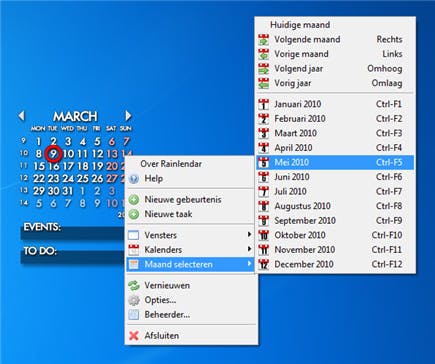 Een sollicitatiegesprek, een afspraak bij de tandarts, de verjaardag van uw schoonmoeder, een instuiffeestje, etc. Het is niet eenvoudig om uw agenda volledig te memoriseren. Dankzij het widget-achtige programmaatje Rainlendar krijgt u volledig gratis een digitaal geheugensteuntje ter beschikking. Afspraken vastleggen is erg eenvoudig. U bepaalt zelf hoeveel informatie u invoert. Van een kort kattebelletje tot een uitgebreide notitie. U kunt eveneens een locatie, webadres, prioriteit en categorie toevoegen. Een alarmsignaal of een terugkeerpatroon instellen behoort eveneens tot de mogelijkheden. Dankzij de vernieuwde toetsencombinaties is het erg eenvoudig om doorheen uw kalender te navigeren. Elke functietoets op uw toetsenbord, van F1 tot F12, staat voor een maand in combinatie met de Ctrl-knop.
