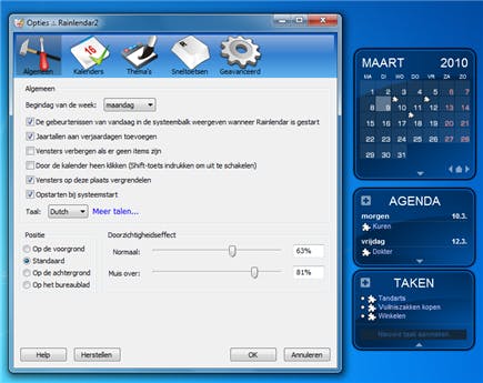 Een sterke troef van Rainlendar is dat u het programma volledig naar uw hand kunt zetten. U kiest zelf of het programma moet opstarten bij een systeemstart, de begindag van de week is eveneens zelf in te stellen en ook de vormgeving kiest u volledig zelf. De positie van de kalender en de transparantheid zijn erg eenvoudig aan te passen. Standaard heeft Rainlendar twee skins ter beschikking, maar via de Rainlendar-website kunt u nog een waslijst extra skins downloaden.