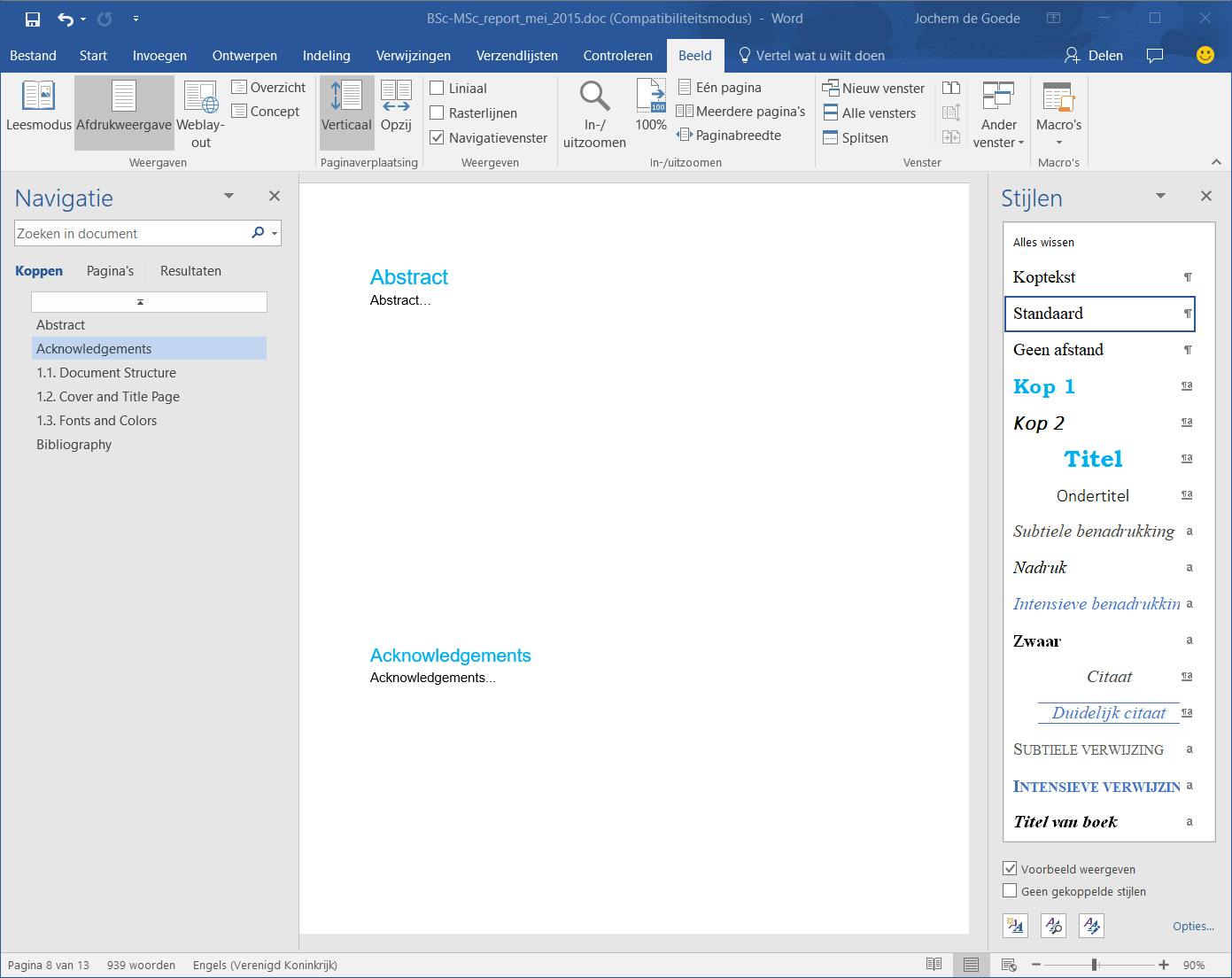 Belangrijk is om de stijlen in zo’n sjabloon juist te gebruiken. In Word 2016 zie je in het Lint bij Stijlen de stijlen van het document. Je ziet ze dan echter niet allemaal. Handiger is om ze altijd rechts in beeld te hebben. Daarvoor klik je in Stijlen rechtsonder op het pijltje en kies je voor Stijlen toepassen. Klik dan in het venster op de A-knop om de stijlen rechts in beeld te tonen. Handig met het gebruik van stijlen en koppen is dat je eenvoudig kunt navigeren en je je geen ongeluk hoeft te scrollen. Ga in het Lint naar Beeld en vink in de sectie Weergeven het Navigatievenster aan.