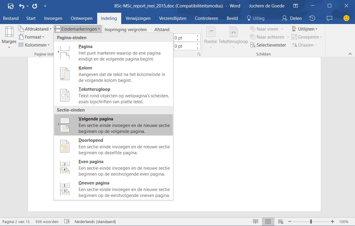 Secties zijn handig voor twee specifieke gevallen: namelijk voor Romeinse nummering of voor liggende pagina’s. Je maakt een nieuwe sectie aan in Word door te gaan naar Indeling / Eindemarkeringen. Kies dan voor een optie uit het menu Sectie-einden, zoals bijvoorbeeld Volgende pagina om na de geselecteerde pagina een nieuwe sectie te laten beginnen. Om een sectie-einde te verwijderen, selecteer je deze en druk op je op de delete-knop op het toetsenbord.