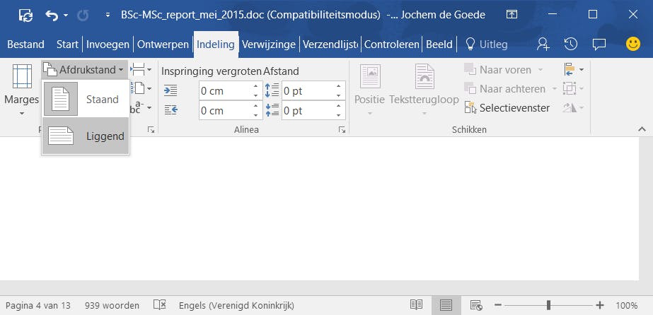 Soms wil je een pagina liggend maken, om een grafiek of tabel goed tot zijn recht te laten komen. Om één of een aantal pagina’s te draaien, moet je een nieuwe sectie aan maken (zie tip 13) voor de pagina die je wilt draaien en weer een nieuwe sectie aan het einde van de pagina die je wilt draaien. Heb je dat gedaan, dan ga je naar Indeling / Afdrukstand en kies je voor Liggend in de lijst, zodat alleen de pagina’s in die sectie gedraaid worden.