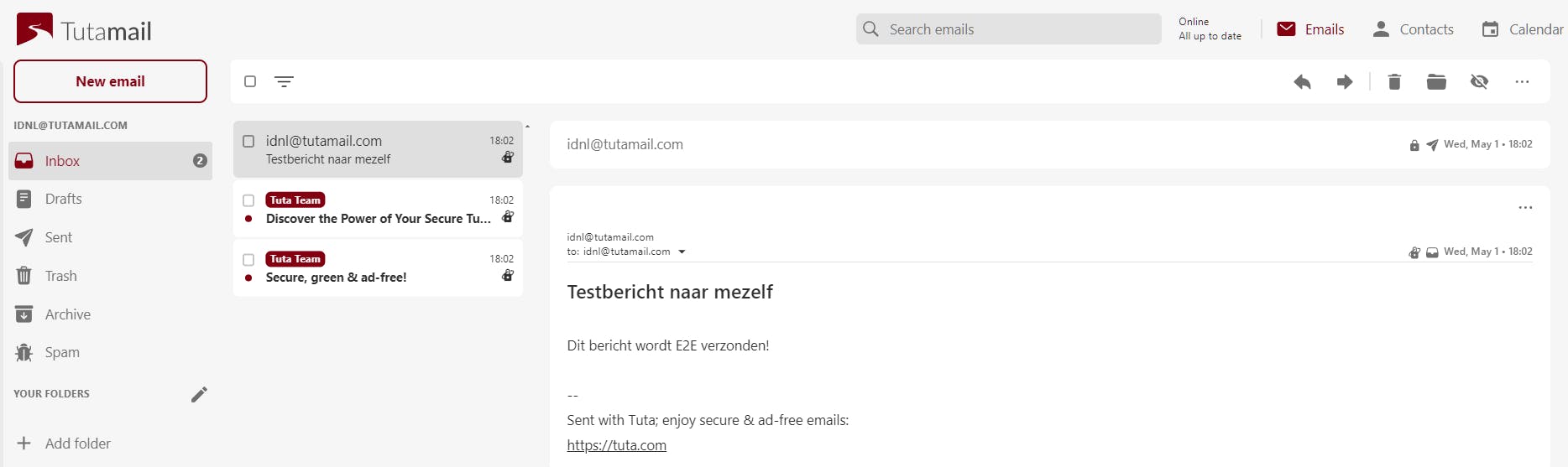 Men zegt weleens dat een e-mail versturen net zo veilig is als een kaart verzenden. Wil je dat je bericht onderweg niet leesbaar is, versleutel dan de inhoud. Dit kan met digitale handtekeningen of met OpenPGP, wat bijvoorbeeld ondersteund wordt in Mozilla Thunderbird. Een eenvoudiger alternatief is een mailservice als ProtonMail of Tuta, met end-to-end (E2E) encryptie. Met een gratis account bij Tuta krijg je tot 1 GB opslagruimte, maar kun je geen eigen domeinnaam instellen. Ook ontvangers zonder Tuta-account kunnen de mail openen, met een vooraf afgesproken wachtwoord.