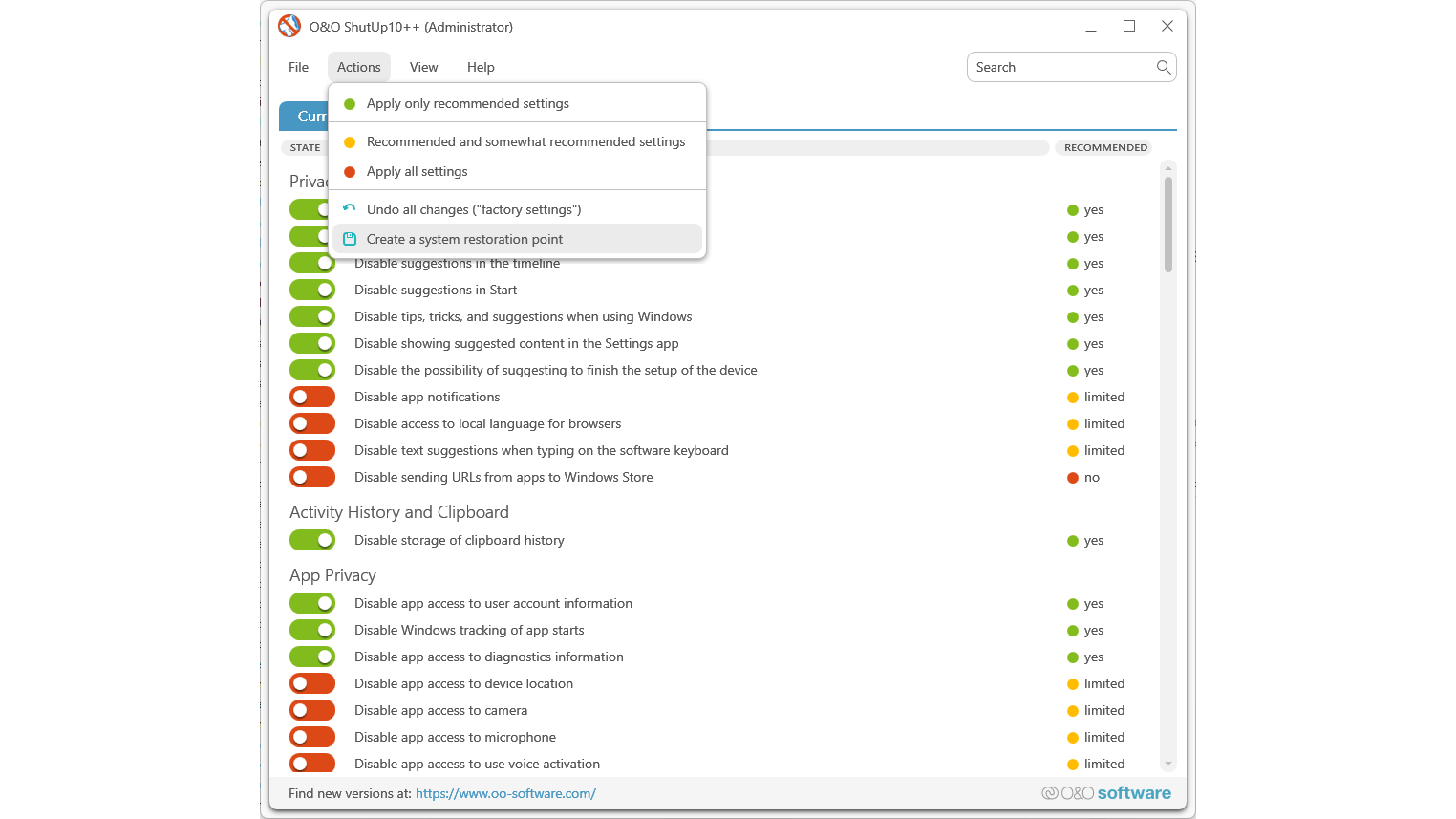 Ook Microsoft verzamelt via Windows privacygevoelige gegevens. In Instellingen / Privacy en beveiliging kun je enkele opties aanscherpen, maar er zijn meer instellingen verspreid over Windows. De portable tool O&O ShutUp10++ maakt dit eenvoudiger. Bekijk de opties bij Current User en Local Machine. Creëer voor je aanpassingen maakt een herstelpunt via Actions / Create a system restore point. In hetzelfde menu zijn enkele vooraf gedefinieerde profielen beschikbaar, Je kunt ook zelf kiezen welke opties je (de)activeert. Indien nodig keer je met Actions / Undo all changes terug naar de standaard instellingen.