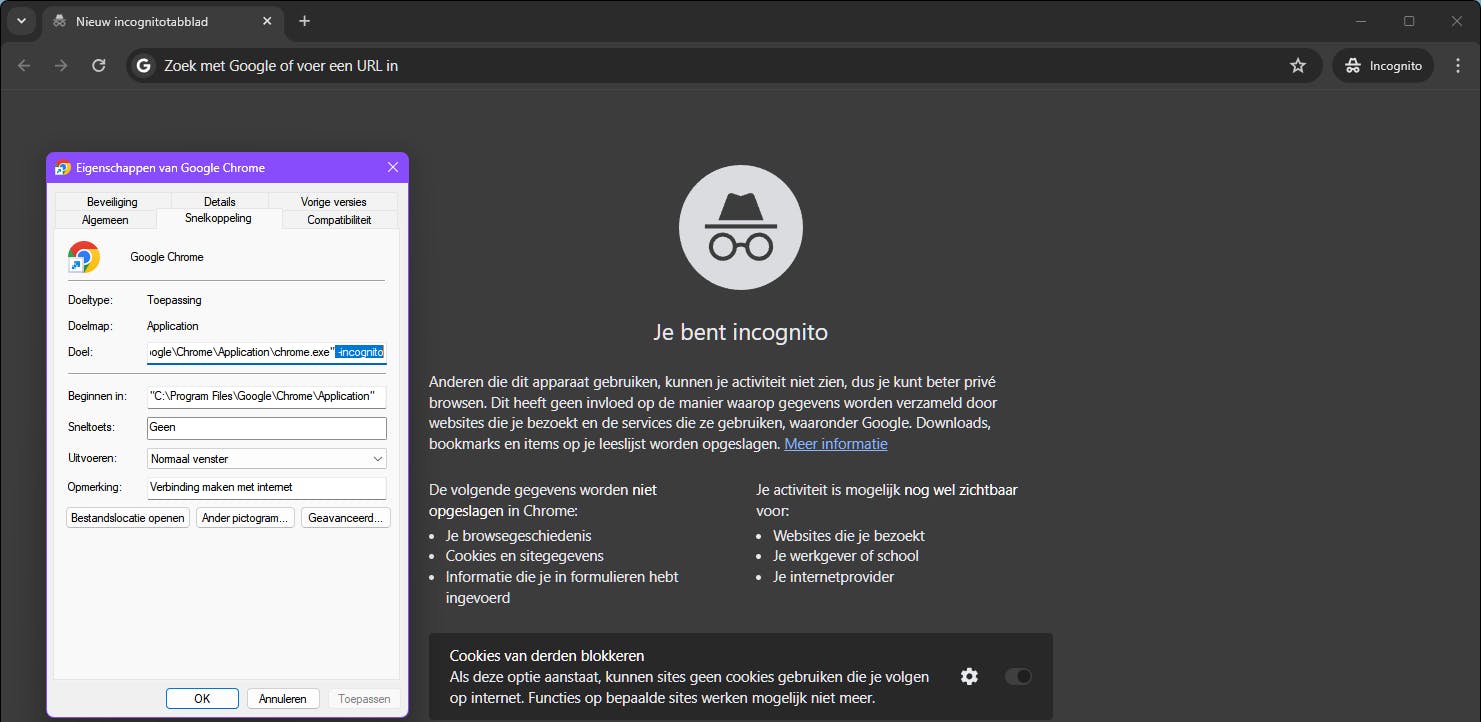 We beginnen met een voor de hand liggende tip: gebruik de incognito-modus van je browser, ook bekend als privé- of InPrivate-venster. In deze modus worden cookies, website- en formuliergegevens gewist zodra je het browservenster sluit. Dit is vooral handig op apparaten van anderen. Start deze modus in een Chromium-browser met Ctrl+Shift+N. Om zo’n browser standaard incognito te openen, voeg je in het eigenschappenvenster van de snelkoppeling, achter het Doel-venster, -incognito toe. Bedenk wel dat deze modus je niet anoniem maakt voor webservers.