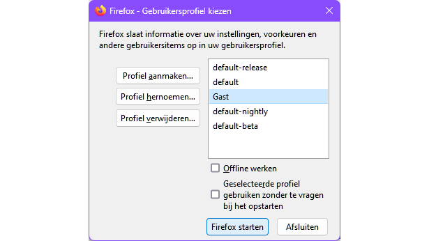Een alternatief voor de incognito-modus is het gastprofiel. Dit activeer je door op je profielicoon te klikken en Gast (Chrome) of Andere profielen / Bladeren als gast (Edge) te selecteren. Firefox heeft geen specifiek gastprofiel, maar je kunt er wel zelf eentje aanmaken voor gastgebruikers. Druk op Windows-toets+R, voer firefox.exe -P uit, kies Profiel aanmaken, noem dit Gast en sluit af met Voltooien. Start Firefox en selecteer het gewenste profiel. Of je werkt in Firefox met ‘containers’: met de add-on Multi-Account Containers kun je gescheiden browsersessies starten, op kleurgecodeerde tabbladen.