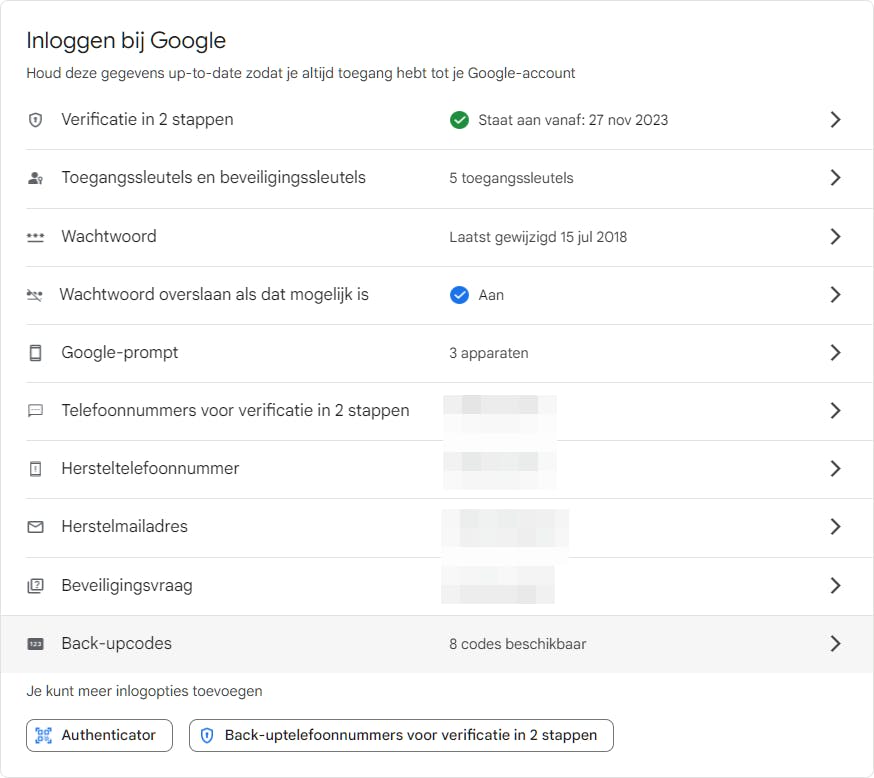 2FA maakt je account veiliger, maar wat doe je als je bijvoorbeeld een OTP-aanmeldcode nodig hebt en je hebt je smartphone niet meer? Dan kun je terugvallen op back-upcodes, een optie die de meeste 2FA-diensten bieden. Log bijvoorbeeld in bij Microsoft, selecteer Beveiliging, open Geavanceerde beveiligingsopties en scrol naar Code voor herstel. Klik op Een nieuwe code genereren, druk de code af en bewaar deze veilig. Voor je Google-account kies je Beveiliging en vervolgens Back-upcodes. Klik op Codes downloaden of Codes afdrukken en bewaar de back-upcodes.