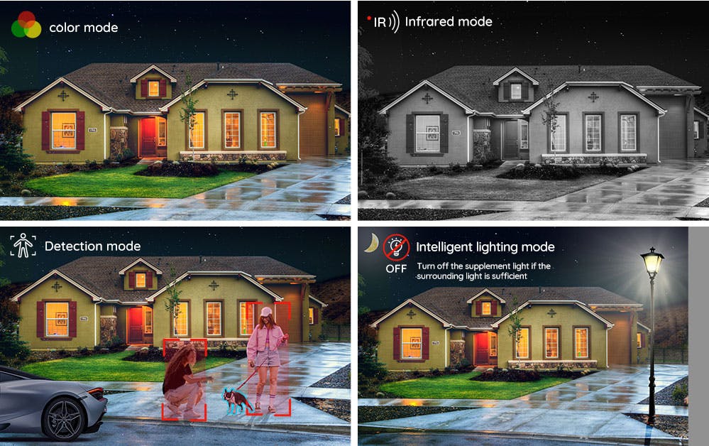 - Detection mode. In de detectiemodus filmt de camera het grootste deel van de tijd in het donker, en dus zwart-wit. Tot er iets beweegt, tenminste. Dan springen de spotlights automatisch aan en kun je haarscherp en in felle kleuren zien wat er gebeurt.