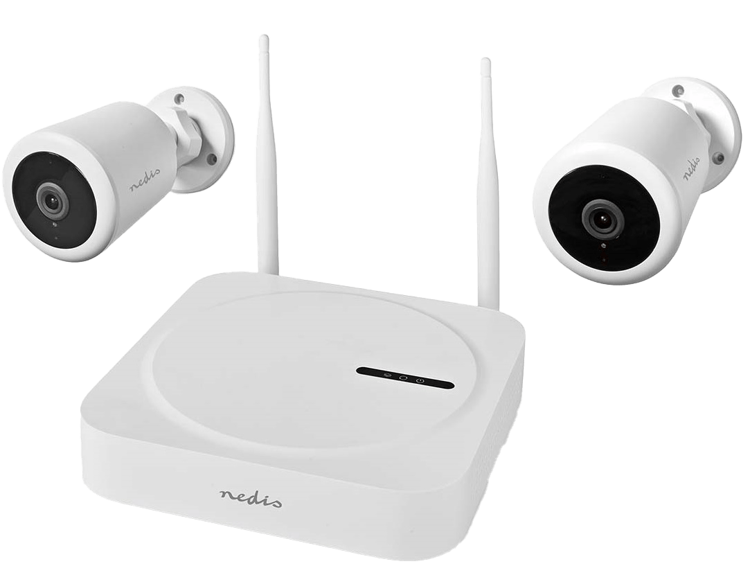 Dit eenvoudige alarmsysteem van Nedis omvat een basisstation en twee buitencamera’s.