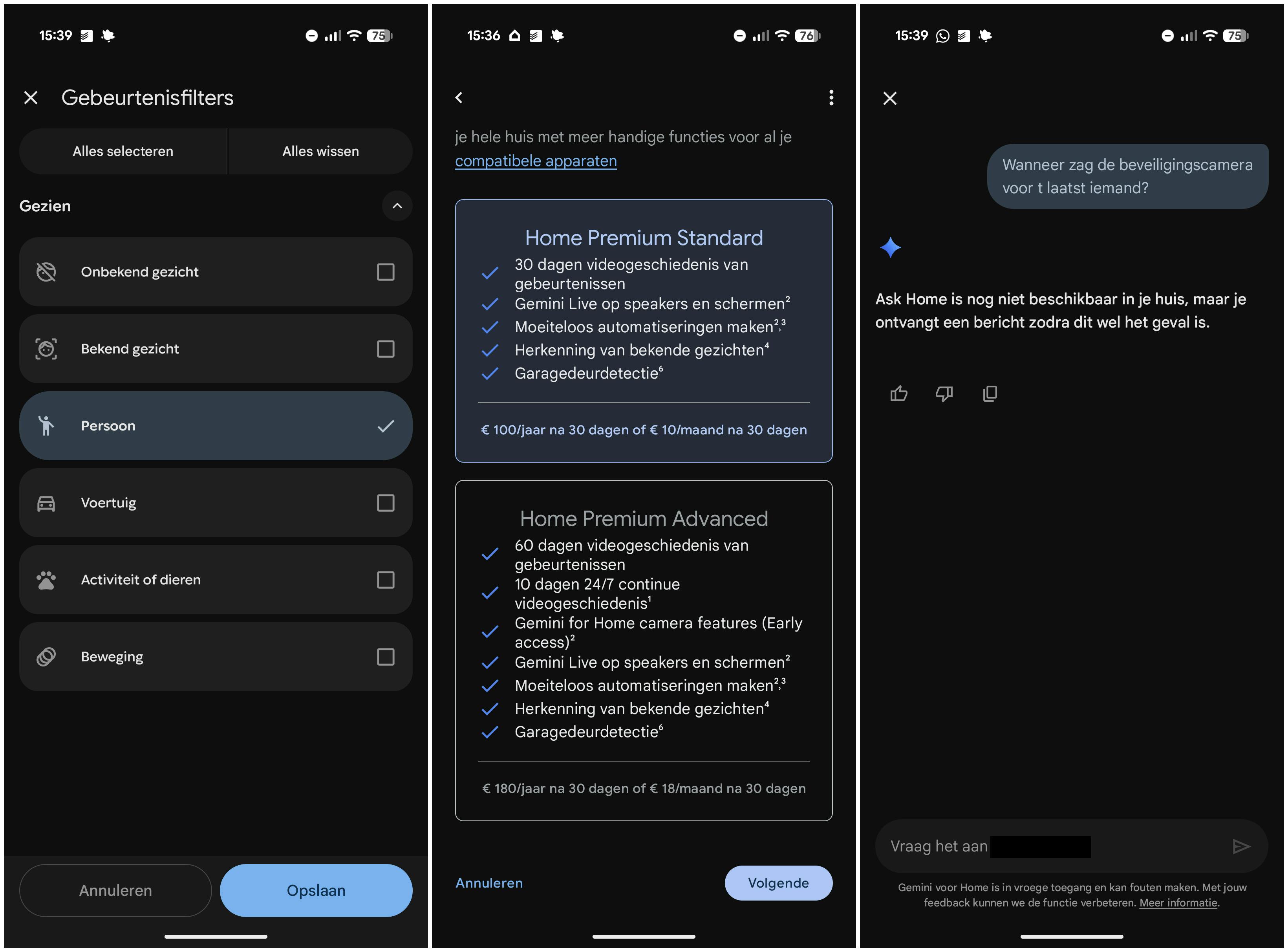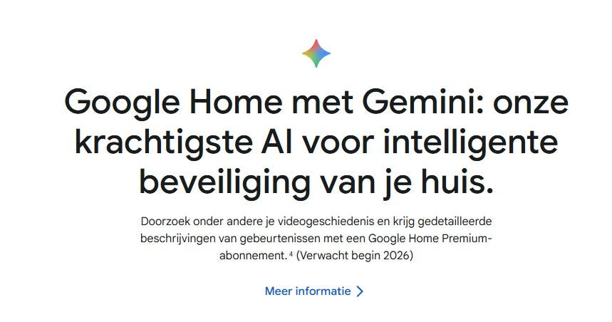 Maar wat blijkt: de Gemini-functies komen pas begin 2026 beschikbaar, zo lezen we op Googles website. In de Home-app kun je bij het camera-tabblad weliswaar vragen stellen aan een AI-chatbot, maar die antwoordt keurig dat hij nog geen antwoord kan geven. Een domper voor de reviewer – die dus nog niet alle beloofde functies kan testen – en voor vroege kopers, die geduld moeten hebben.