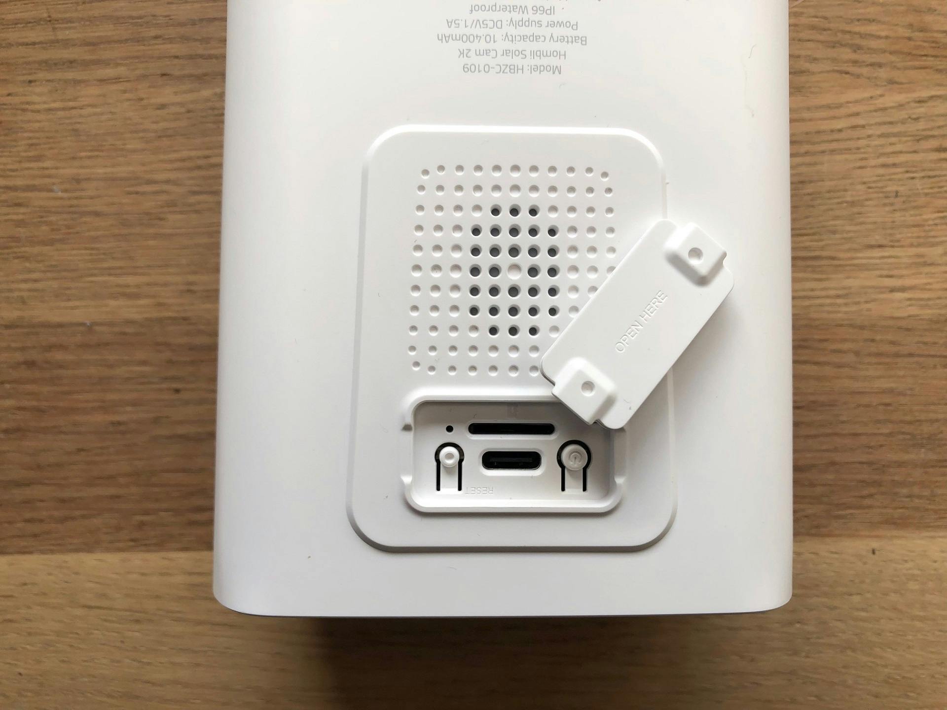 Deze camera heeft een brede behuizing van stevig kunststof. Je kunt de Solar Cam 2K op geen enkele plek indrukken, waardoor hij naar verwachting wel tegen een stootje kan. Het product is IP66-gecertificeerd en daarmee dus weerbestendig. Boven de camerasensor telt de voorzijde vier kleine ledlampjes. Die maken nachtzicht in kleur mogelijk. Aan de onderkant bevindt zich een uitneembaar klepje met toegang tot de usb-c-aansluiting, geheugenkaartlezer, resetknop en aan-uitschakelaar. Verder zien we onderop ook een kleine speaker. De achterkant heeft een ronde ingang van schroefdraad waarop je de muursteun kunt vastmaken. Overigens stelt de montage weinig voor. Boor vier gaten en schroef de wandsteun vervolgens vast. Daarna kun je de camera richten en vastdraaien. Helaas is deze constructie wel diefstalgevoelig. Kies daarom het liefst een lastig bereikbare plek met voldoende wifi-dekking.