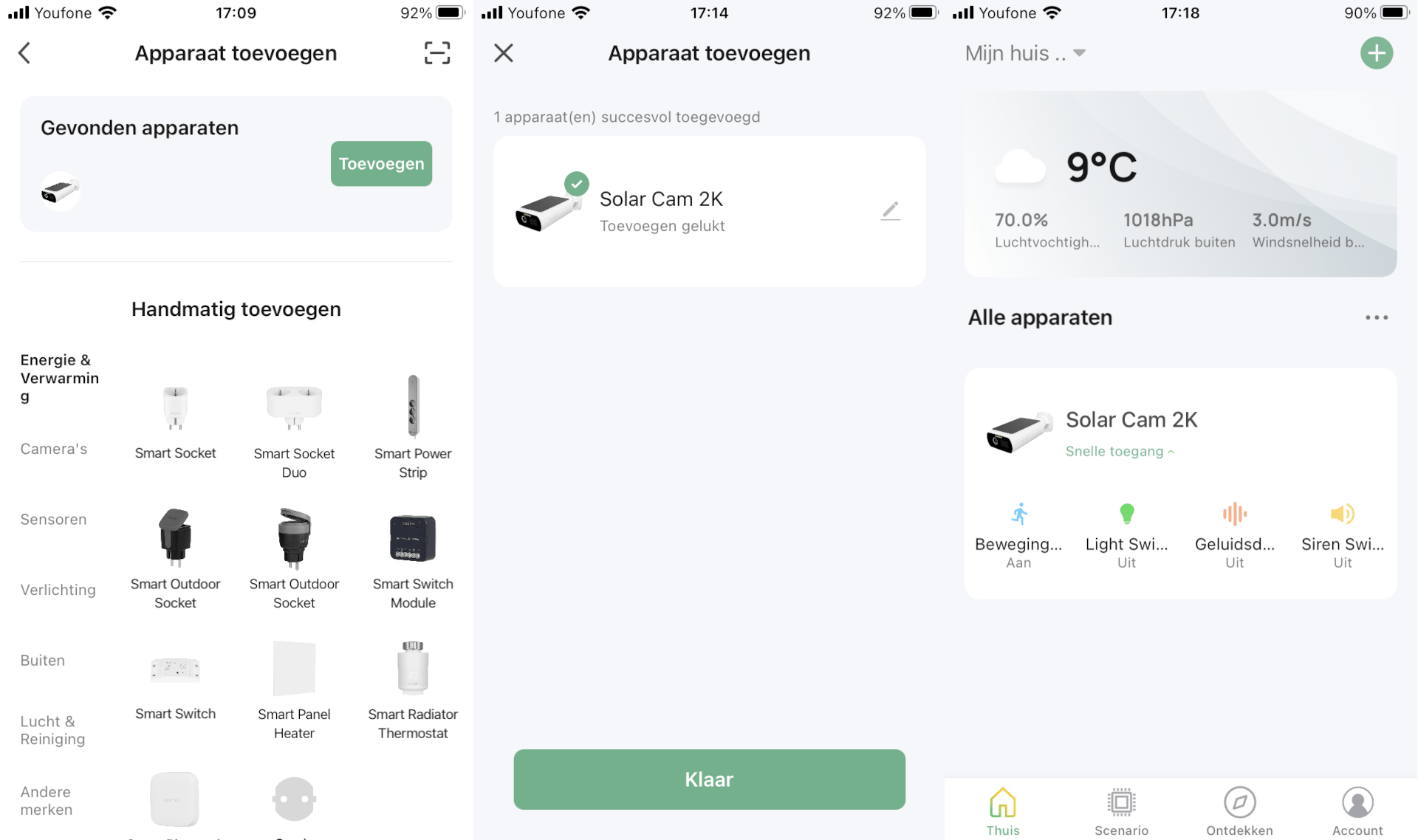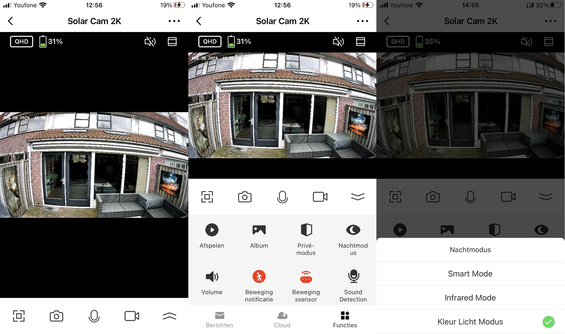 Net zoals vrijwel alle hedendaagse beveiligingscamera’s configureer en bedien je ook dit exemplaar met een app (Android/iOS) op je smartphone. Aan de hand van duidelijke Nederlandstalige stappen zien we al gauw livebeeld. Na het aanmaken van een account voeg je de camera makkelijk toe. Dat gaat via de koppelmodus pijlsnel, want de app herkent het apparaat direct. Je hoeft daarna alleen nog maar het wachtwoord van jouw wifi-netwerk op te geven. Houd er trouwens rekening mee dat de Solar Cam 2K alleen met de 2,4GHz-frequentieband overweg kan, want jammer genoeg ondersteunt het product geen 5GHz. De resterende stappen spreken voor zich. Zodra je de kreet ‘the camera is online’ hoort, verschijnt er beeld.