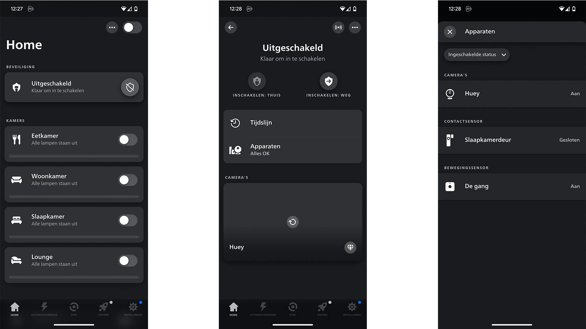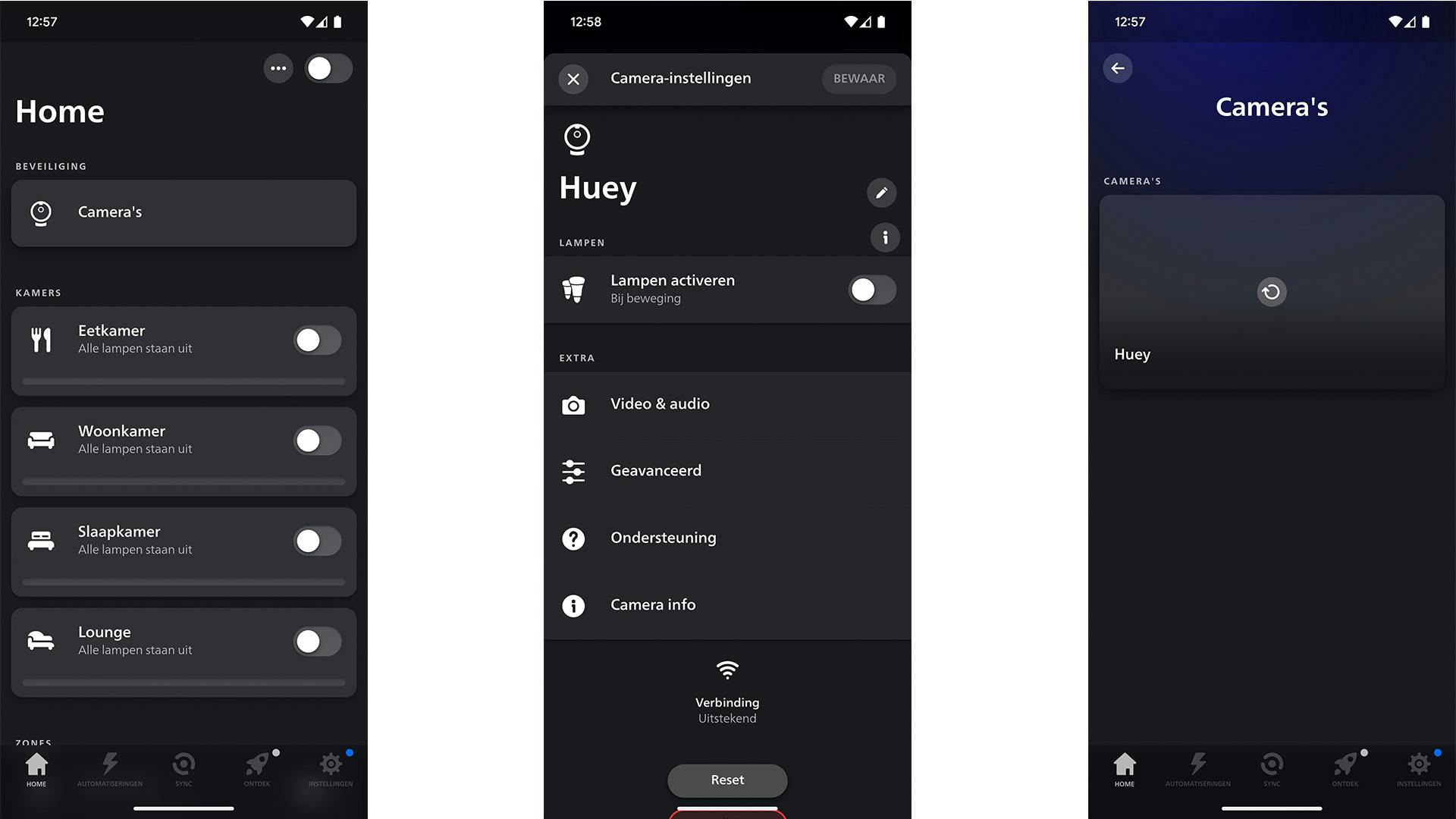 En daarmee hebben we meteen het onderscheidende karakter van de Philips Hue Secure Camera (en aanverwante Secure-apparaten) te pakken: je kunt hem laten samenwerken met andere Philips Hue-producten in huis. Is er niemand thuis, maar registreert de camera wel beweging? Dan kan die de lampen fel laten pulseren en een alarm laten afgaan. Het alarm heeft een maximaal aantal decibel van 80, waardoor de buren het mogelijk niet horen. Maar mocht je zelf op zolder zijn en verwacht je niemand in huis, dan is het geluid luid genoeg om je te waarschuwen.