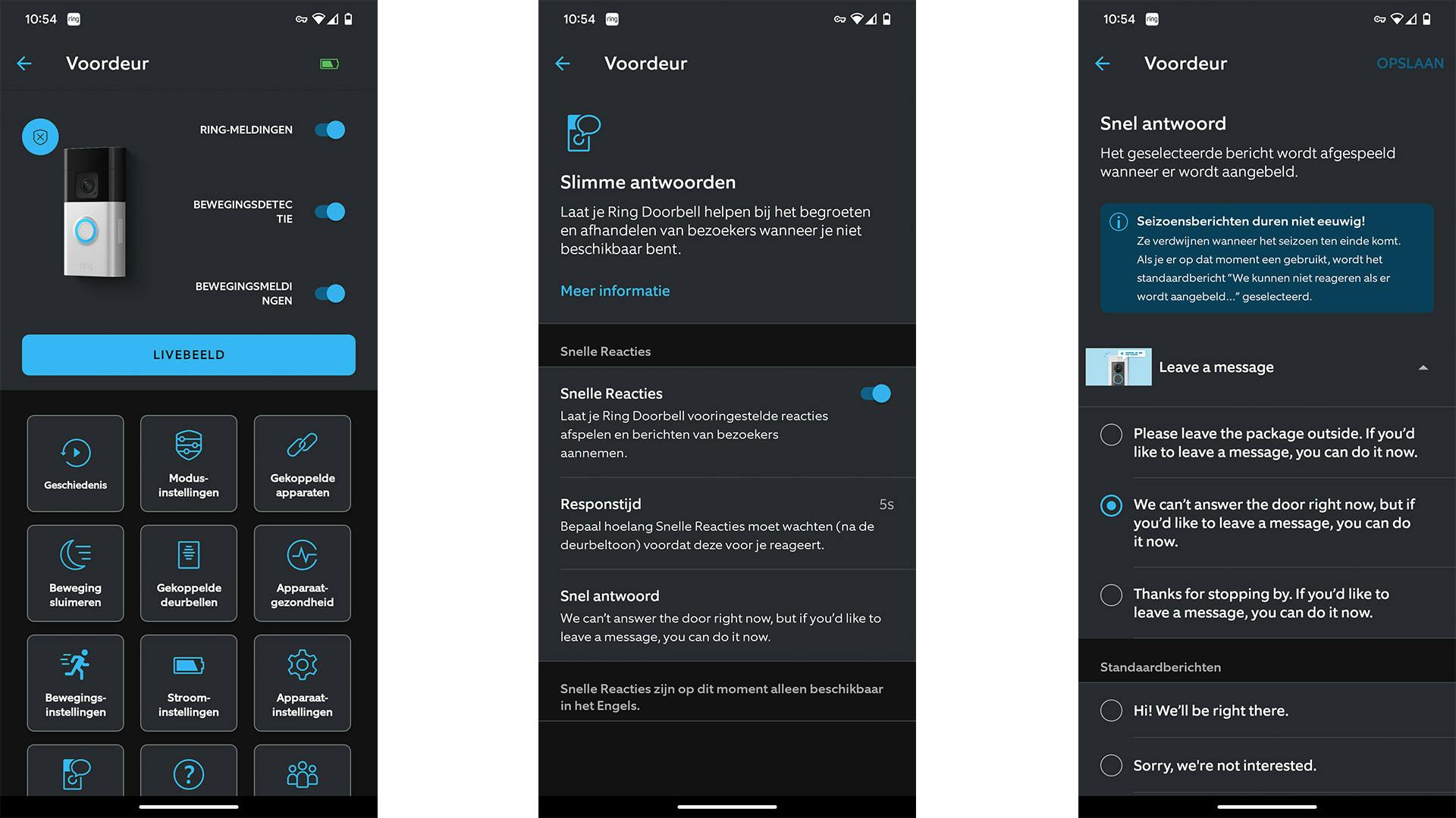 Maar goed, als je dan investeert in zo’n abonnement, hoe werken die opties dan? Met Slimme antwoorden kun je de Ring Battery Doorbell Plus een respons laten uitspreken wanneer iemand aanbelt en je niet in staat bent op te nemen. Die antwoorden zijn allemaal in het Engels. In tegenstelling tot de TP-Link Tapo D230 ben je niet in staat zelf een reactie in te spreken, zodat je een Nederlands bericht kunt achterlaten. De standaardopties zijn handig doch beperkt. Vaak komen ze niet verder dan “we komen eraan”, “niet geïnteresseerd” of “zet dat pakketje maar neer”.