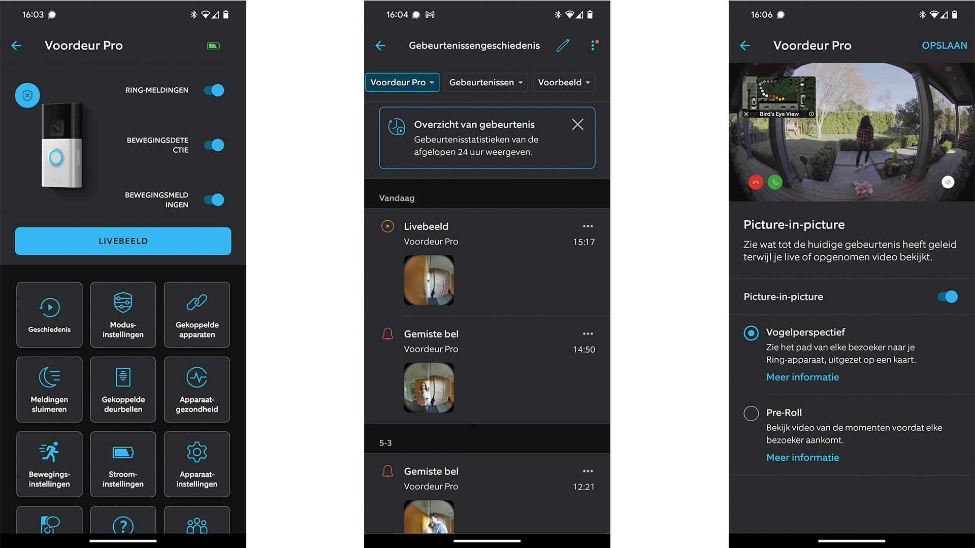 En als we het nog even op de verschillen tussen beide apparaten houden, dan zien we dat de Ring Battery Video Doorbell Pro beschikt over een langwerpige weergave. De Plus heeft een vierkante fisheye-lens, waardoor je goed kunt zien wat er op de mat ligt. Dat is handig voor pakketherkenning (of kleine kinderen); maar door die langwerpige weergave kun je ook met de Pro goed zien wat er op de mat gebeurt. Met een kijkhoek van 150 graden hoef je bovendien weinig tot niets te missen – maar dat is een eigenschap die de deurbellen met elkaar gemeen hebben.