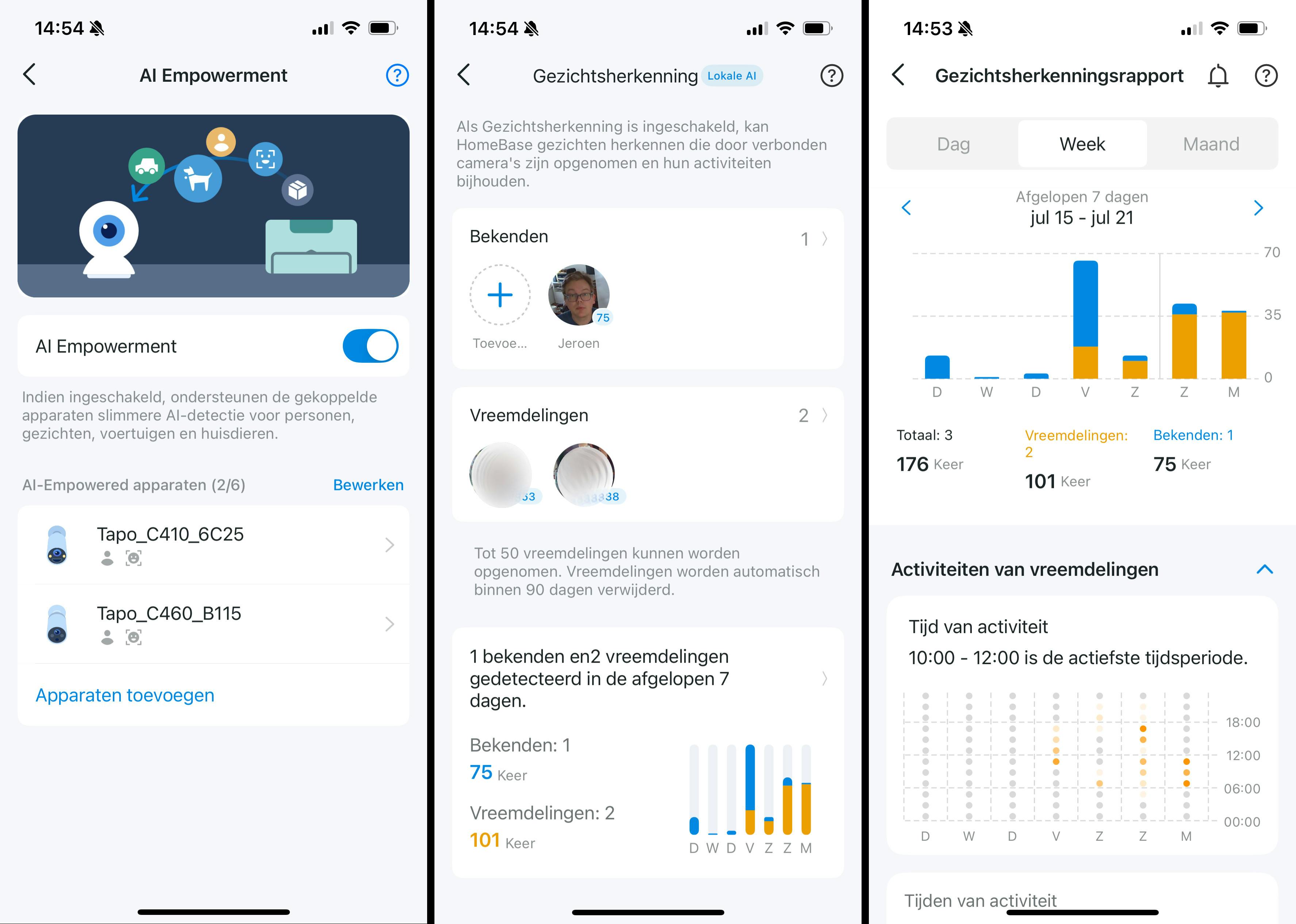 Behalve opnemen kan de Smart HomeBase H500 ook AI-functies toevoegen aan Tapo-camera's. De HomeBase kan maximaal zes camera's betere herkenningsmogelijkheden geven op basis van AI, maar dat wordt ook als je minder dan zes camera's hebt niet automatisch ingeschakeld. Je kunt dat zelf doen door in de app op de tegel AI Empowerment te klikken. De camera's kunnen dankzij AI personen, gezichten, voertuigen en huisdieren herkennen. Je kunt zelf bepalen welke herkenningsmogelijkheden actief zijn. Herkende personen verschijnen vervolgens automatisch in de app waarna je eventueel kunt aangeven wie die personen zijn.