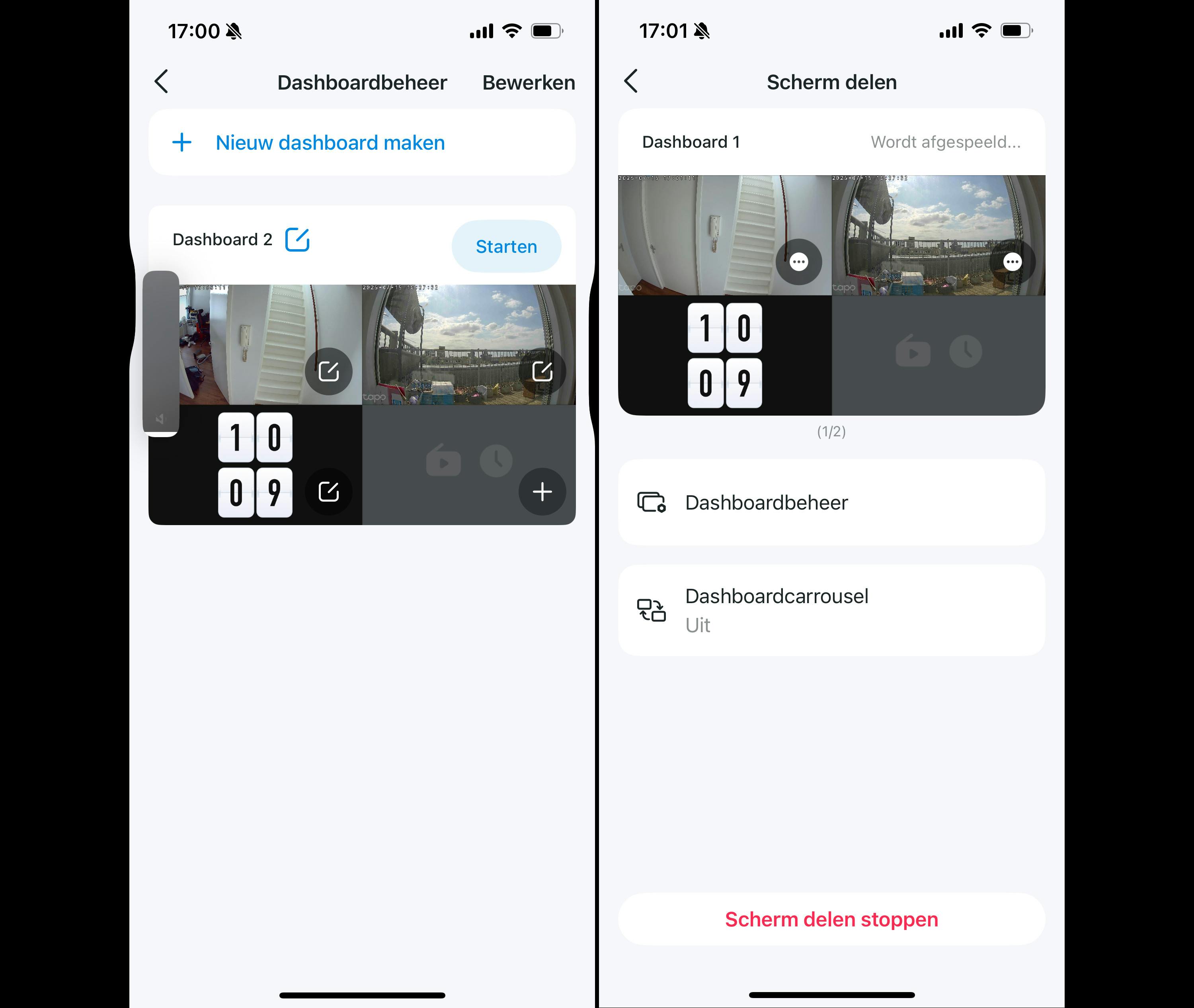 De Tapo Smart HomeBase H500 is voorzien van een HDMI-uitgang waarmee je de hub kunt aansluiten op een televisie of monitor. Je kunt in de app een dashboard configureren bestaande uit één of vier secties. Zo kun je maximaal vier camera's tegelijkertijd bekijken. Heb je minder dan vier camera's, dan kun je ook kiezen voor een klok. Dat klinkt op zich handig, maar met batterijgevoede camera's zoals wij tijdens de test hebben gebruikt, heb je daar niet zoveel aan. Je ziet in het dashboard alleen beeld als de camera op dat moment beweging detecteert. Het is dus niet mogelijk om naar wens live mee te kijken. Het is ook niet mogelijk om via de televisie oudere opnames te bekijken die op de Smart HomeBase staan. Deze functie heeft kortom alleen enigszins nut als je op netstroom gevoede camera's hebt.