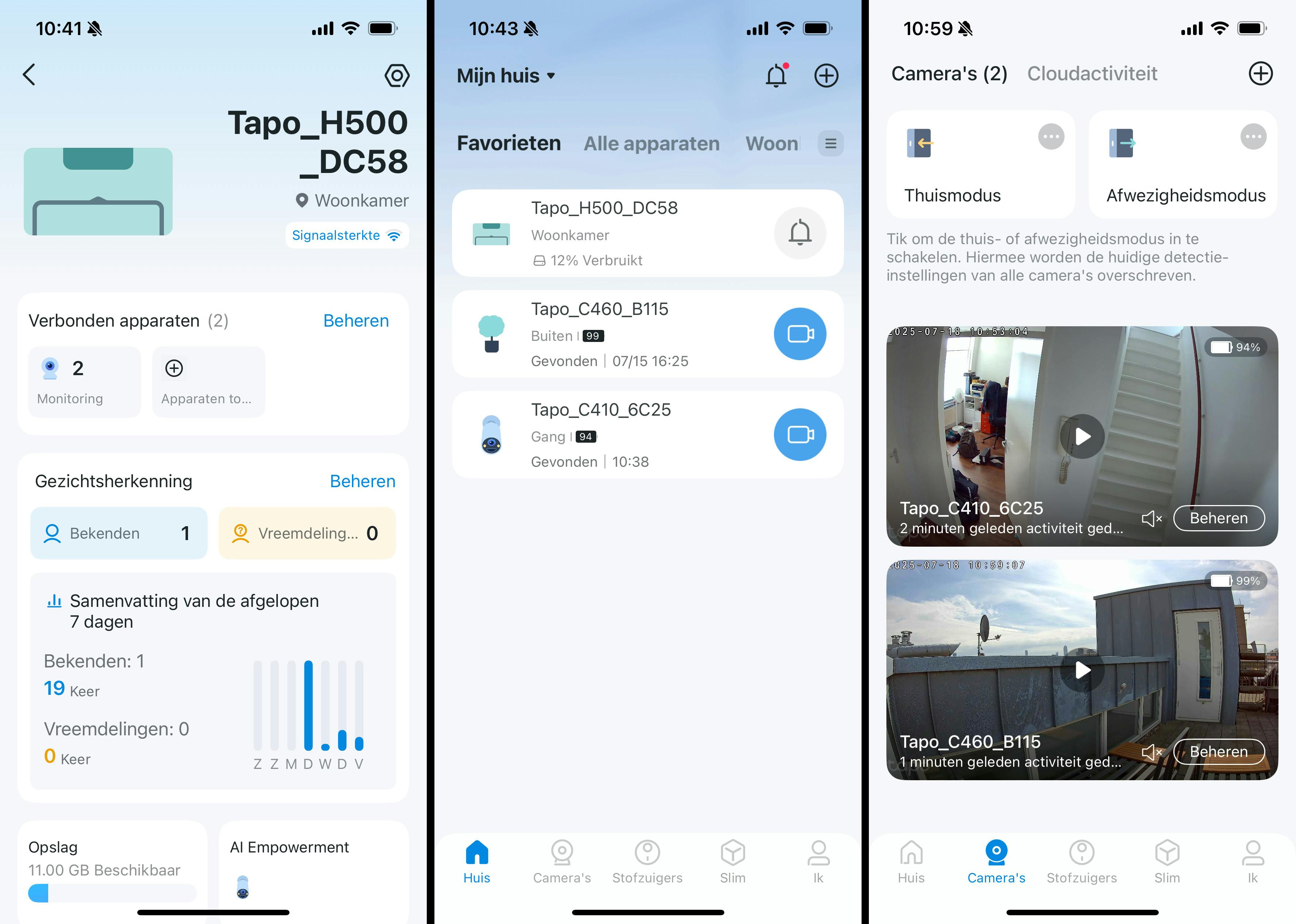 De H500 moet aan je Tapo-camera's worden gekoppeld. Dat is enigszins verwarrend, want dat kan als je al camera's hebt op twee manieren. Onze camera's (de C410 en C460) stonden niet in de lijst die je ziet als je eerst op de H500 klikt, maar wel in de andere lijst. Begin je met de H500, dan speelt dat probleem niet en worden ondersteunde camera's automatisch gekoppeld.