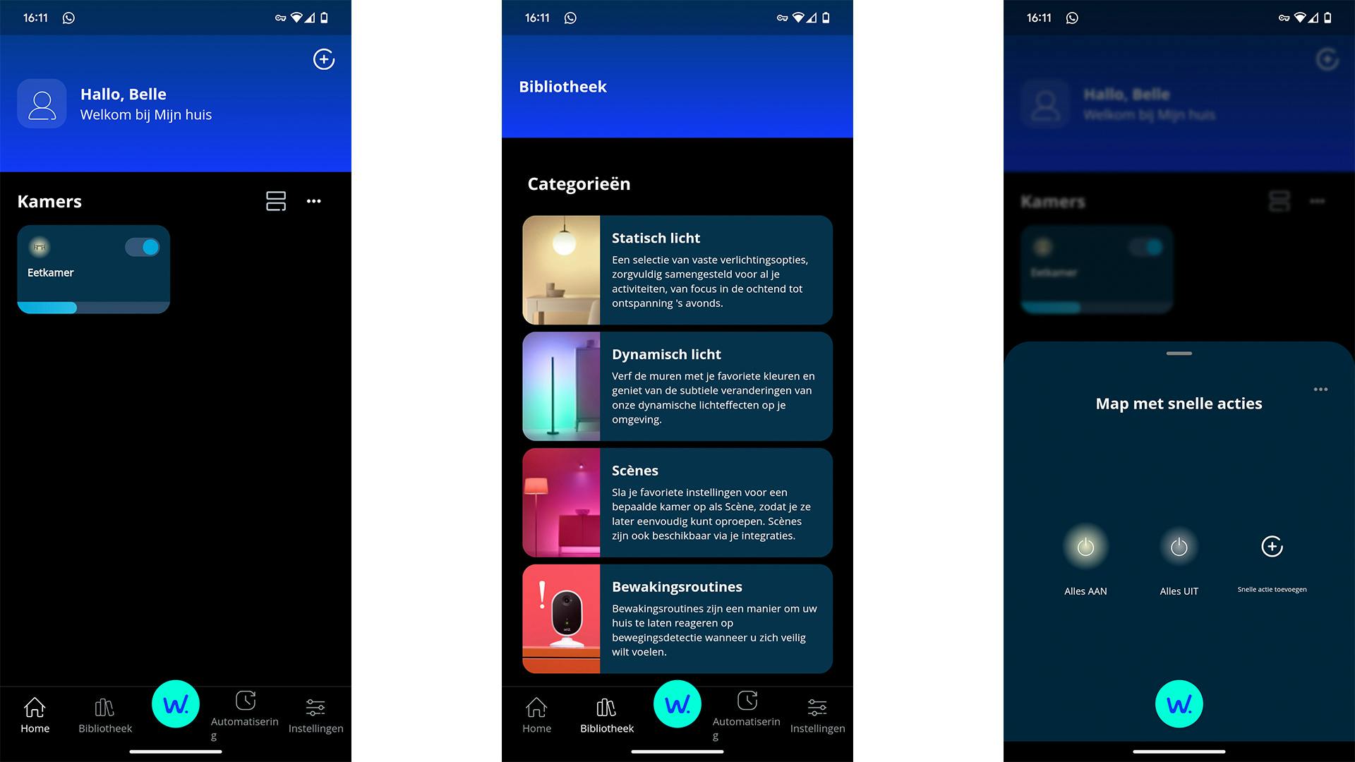 De applicatie is overzichtelijk en werkt snel, maar negeert soms ook je input. Dan moet je een paar keer op de digitale knopjes of schuifregelaars tappen om iets voor elkaar te krijgen. De indeling is vrij logisch, met de apparaten en kamers in je huis, automatiseringen en instellingen op een rijtje op de onderste navigatiebalk. De optie bibliotheek is een vreemde eend; daar hadden we een overzicht van apparaten of opgenomen beelden verwacht, maar hier tref je de lampenopties aan.