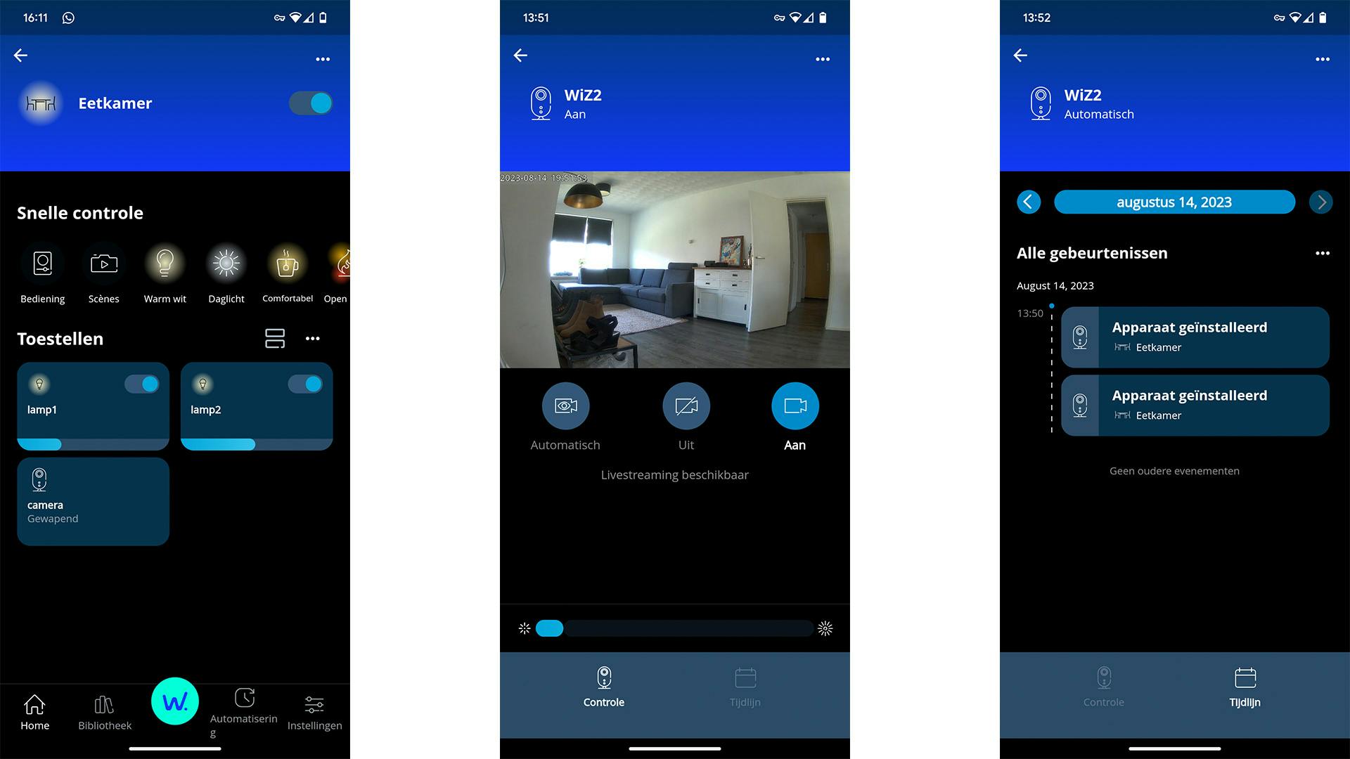 Binnen de drie tabs die wel logisch overkomen, vinden we een intuïtieve indeling die gericht is op het gebruik van lampen. Dat is niet gek want Wiz is natuurlijk een systeem voor slimme verlichting. Je kunt met een enkele tap lampen in- en uitschakelen (maar met SpaceSense hoeft dat als het goed is niet) of van helderheid of effect wisselen. Wanneer je de opties voor de Wiz Indoor Camera opent, krijg je niet alleen de camera-opties, maar ook de lampenopties te zien. Zo kun je bijvoorbeeld de alarmstand van je lampen activeren als je iets merkwaardigs opmerkt.