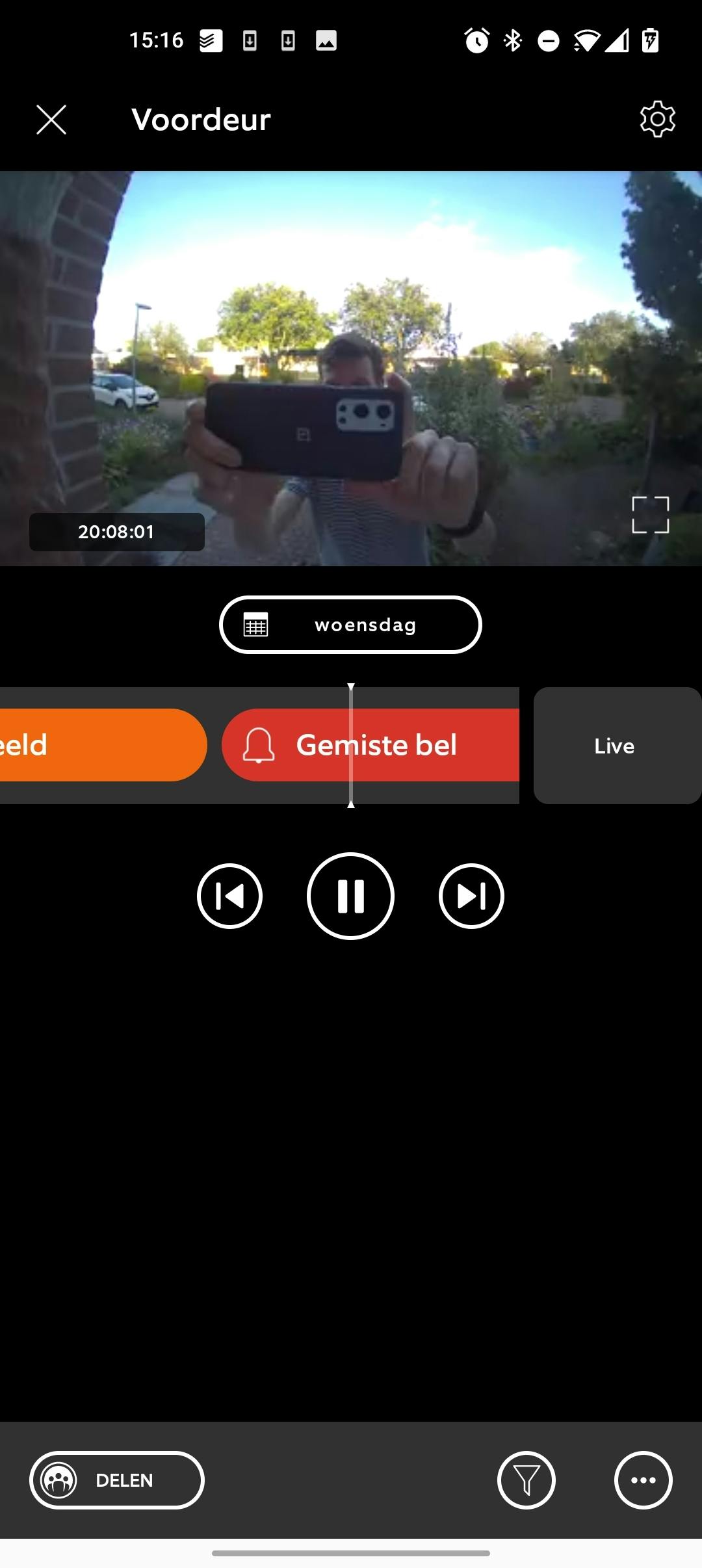 Je krijgt een melding als iemand aanbelt en kunt dan 'opnemen' om live te kijken en eventueel een gesprek te starten. In de Ring-app kun je ook instellen dat de bel meldingen stuurt als hij beweging detecteert. Ik heb dit na een paar dagen uitgeschakeld omdat ik er geen behoefte aan heb. De functie werkt overdag beter dan in het donker. De eerder geteste Ring Video Doorbell Pro 2 is beter geschikt als beveiligingscamera, maar ook honderden euro's duurder.