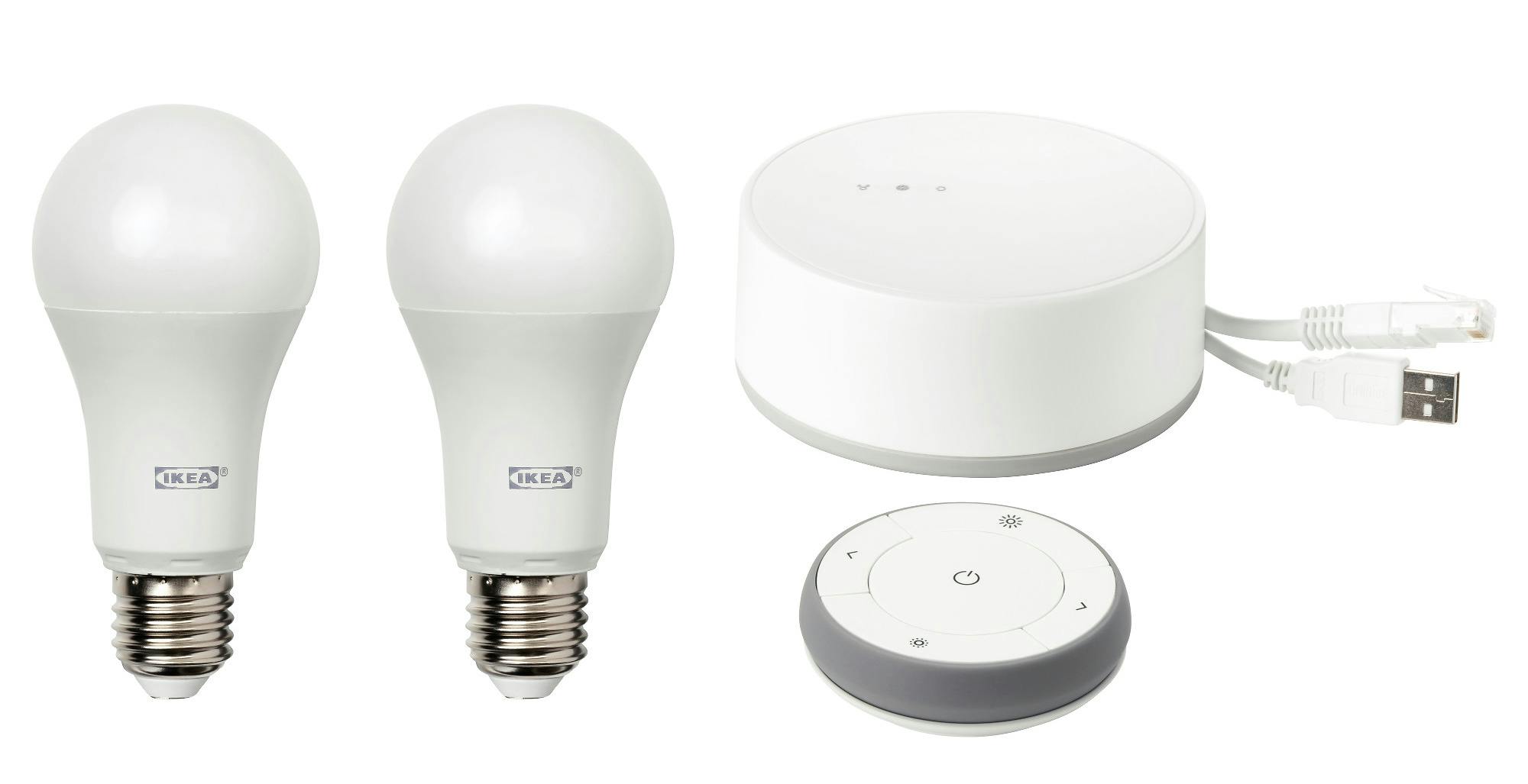 Sinds het voorjaar van 2017 heeft Ikea onder de naam Trådfri een slim verlichtingssysteem onder zijn hoede. Oorspronkelijk verkocht de Zweedse meubelwinkelketen alleen (warm)witte lampen, maar sinds kort kunnen klanten ook een heuse kleurenlamp aanschaffen. De peertjes zijn beschikbaar met een E27-, E14- en GU10-fitting, zodat je ze in bestaande armaturen kunt draaien. Bij iedere losse lamp zit een besturingselement bijgesloten, namelijk een draadloze dimmer, afstandsbediening of bewegingssensor.