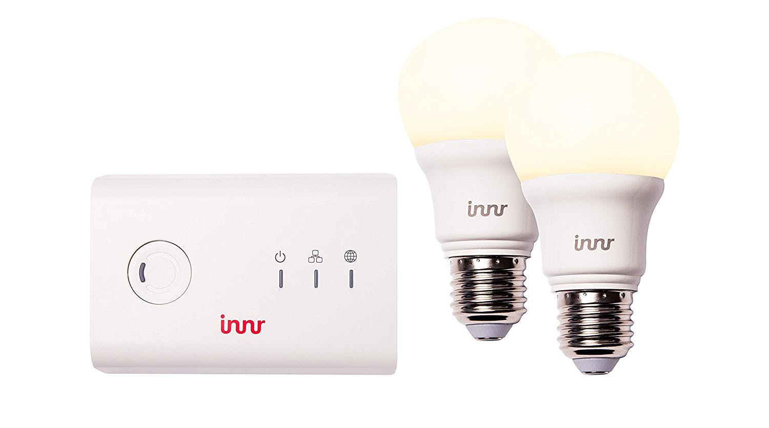 Het Nederlandse Innr brengt allerlei slimme lampen op de markt, waaronder (gekleurde) ledpeertjes, GU10-spotjes, flexibele ledstrips en lichtbalken. De Starter Kit SK RB 162 bestaat uit twee (warm)witte lampen met een E27-fitting en een verbindingshub. Een pluspunt is dat je maximaal honderd apparaten op deze verbindingshub kunt aansluiten, waardoor er een zeer uitgebreid verlichtingssysteem mogelijk is.