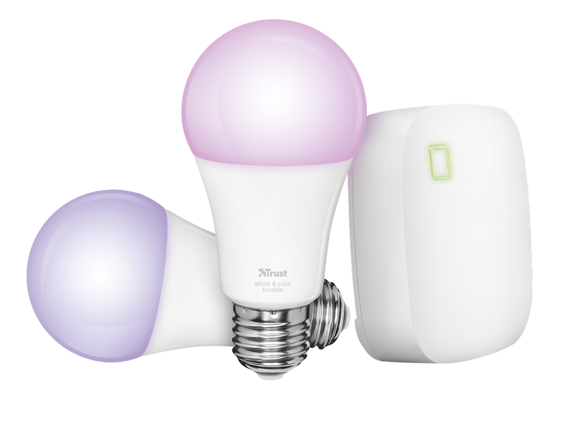 Heb je alleen behoefte aan slimme verlichting, dan is de Starter Set Z1 ZigBee Bridge een laagdrempelig beginpunt. Dit product bestaat uit twee gekleurde E27-peertjes en een verbindingshub. Het nominale vermogen en de lichtstroom bedragen van beide lampen respectievelijk 9 watt en 806 lumen. Gebruikers kunnen maximaal twintig lampen op de verbindingshub aanmelden, die zich stuk voor stuk laten bedienen vanuit de Trust SmartHome-app.