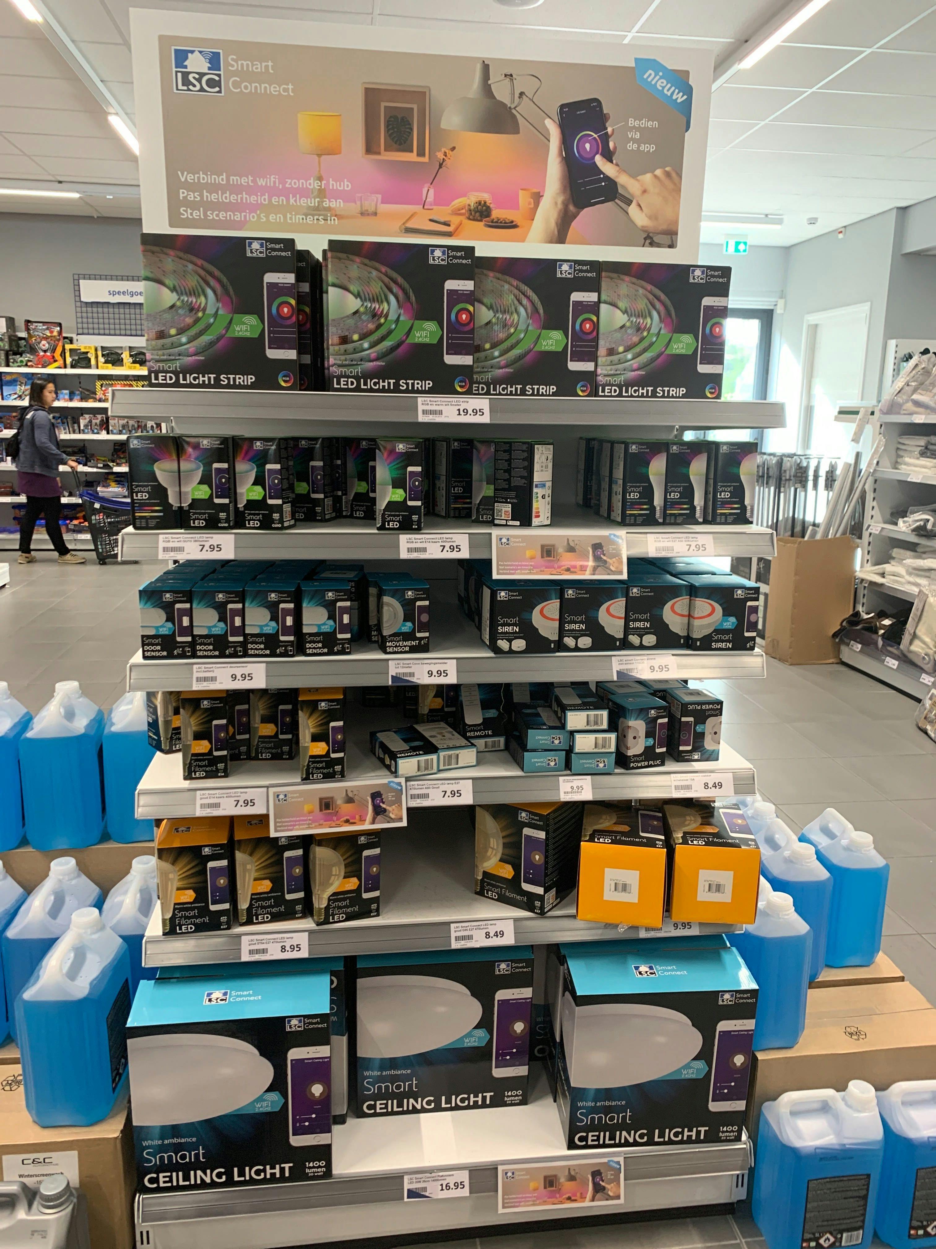 De discounter Action heeft een vrij breed smart assortiment slimme producten op de markt gebracht, onder de naam LSC Smart Connect. De keten komt met een vrij groot aantal slimme lampen. Het introduceert niet alleen een simpel slim ledlampje maar heeft gelijk vijf verschillende soorten slimme filament-ledlampen (dat zijn lampen die op ouderwetse gloeilampen lijken) in het assortiment. Daarnaast zijn er twee soorten multicolor-ledlampen beschikbaar en een multicolor-spotlamp met GU10-fitting. Verder zijn er een plafonniere en een slimme ledstrip te verkrijgen.