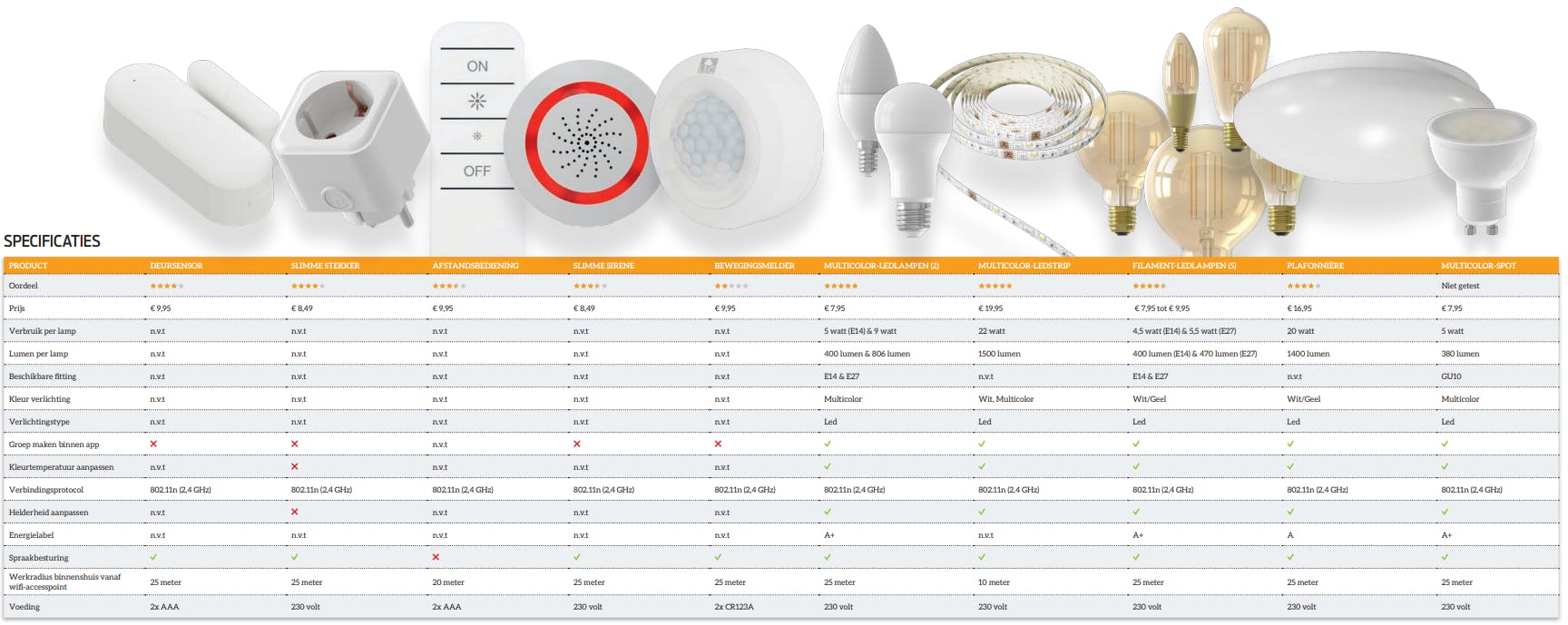 Naast het lampen-assortiment zijn er ook een sirene, een bewegingsmelder, een deursensor, een afstandsbediening en een slimme stekker opgenomen in deze reeks. Je kunt dus niet alleen je huis slim verlichten, er zijn ook andere mogelijkheden om je huis slimmer te maken. Dit maakt de verzameling smart-producten van Action een vrij compleet pakket.