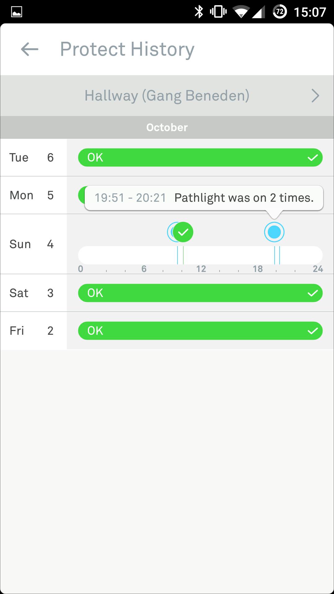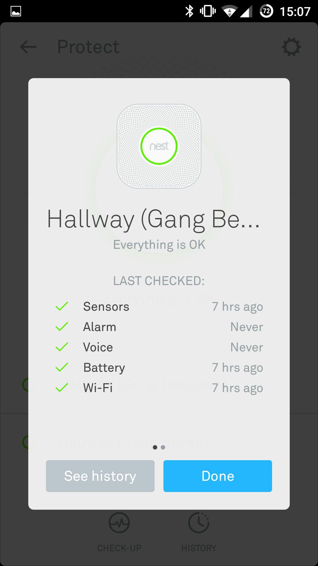 De Protect koppel je aan de speciale Nest-app, waar ook de andere Nest-producten als de thermostaat in worden bediend. De app geeft je een pushmelding als er rook, brand of koolmonoxide wordt gedetecteerd, en je kunt er onder andere de geschiedenis van je rookmelder in bekijken. Dat is niet heel spannend; in de praktijk vindt er iedere dag een check plaats of de batterijen het nog doen en of de rookmelder nog werkt. Die gegevens zie je in de app terug.