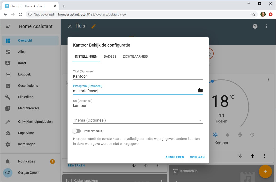 We gaan naar het standaarddashboard Overzicht. Om het beheer over te nemen klikken we in het menu rechtsboven (de drie puntjes) op Configureer UI. Je ziet een waarschuwingsvenster dat het dashboard daarmee niet meer automatisch wordt bijgewerkt. Je kunt er eventueel voor kiezen om met een lege pagina te beginnen, door een vinkje bij deze optie te zetten. Klik daarna op Neem over. Tenzij je het vinkje hebt gezet, worden de bestaande onderdelen overgenomen in het dashboard waar je nu handmatig het beheer over hebt. Er is een eerste tabblad gemaakt met de naam Home. Via het penceeltje veranderen we de naam naar Thuis. We willen een extra tabblad maken, wat binnen Home Assistant een weergave of view wordt genoemd, voor kantoor. Hiervoor klikken we op het plusteken, voeren de titel Kantoor in en eventueel een pictogram, bijvoorbeeld mdi:briefcase, één van de Material Design-iconen. Deze iconen kun je op veel plaatsen in Home Assistant gebruiken. Hier kun je zien welke iconen er zoal zijn. De overige opties laten we ongemoeid en we kiezen Opslaan.