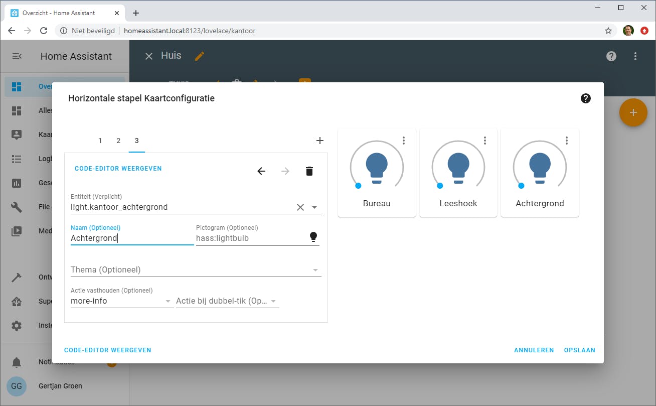 We willen wat knoppen voor lampen naast elkaar: in dit voorbeeld een Hue Go-lamp voor achtergrondverlichting, een Yeelight-lamp boven het bureau en bij de leeshoek en een KlikAanKlikUit-schakelaar voor de bergruimteverlichting. Ze zijn allemaal aan Home Assistant toegevoegd. Eerst klikken we op het plusteken rechts om een kaart toe te voegen en kiezen voor Horizontale stapel. Op zo’n kaart kun je andere kaarten stapelen (zie kader ‘Horizontale of verticale stapel’) wat ideaal is om de lampen naast elkaar weer te geven. Als eerste voegen we een kaart genaamd Lamp toe waarbij we onder het kopje Entiteit de gewenste lamp kiezen. Stel eventueel een vervangende naam in, als de naam onduidelijk of te lang is. De twee andere lampen voegen we op vergelijkbare wijze toe via het plusteken. Voor de schakelaar voor de bergruimteverlichting kiezen we de kaart Knop en vullen een passend icoontje in. Je kunt eventueel Material Design-icoontjes kiezen zoals uitgelegd in de vorige stap. Bijvoorbeeld mdi:flashlight voor een zaklampicoontje. Kies Opslaan als je klaar bent. We gebruiken hier steeds de visuele editor, maar je kunt ook code invoeren. Klik daarvoor op Code-editor weergeven. Je kunt daarna ook weer wisselen naar de visuele editor.