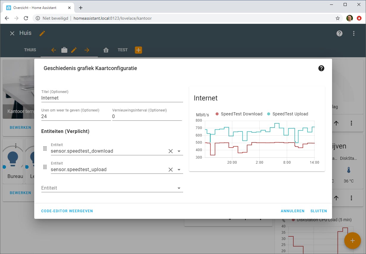 Om in het dashboard de snelheid van je internetverbinding te zien, kun je eenvoudig via Instellingen / Integraties de component Speedtest.net toevoegen. Daarmee wordt elk uur de download- en uploadsnelheid van de internetverbinding getest op de gekozen testserver. Via de sensor kun je de waarde uitlezen. Om de laatste meting weer te geven kun je bijvoorbeeld een Horizontale stapel toevoegen en daarin twee kaarten van het type Meter met als entiteit de sensor voor de download- en uploadsnelheid. Nog mooier is een grafiek met de geschiedenis van je metingen. Standaard houdt Home Assistant gegevens van onder meer sensoren bij in een lokale database, dus je hoeft daar niets voor te doen. Voeg hiervoor een kaart van het type Geschiedenis grafiek toe. Hierin kun je één of meerdere entiteiten opnemen. Wij kiezen weer de twee entiteiten en geven aan dat we de metingen van de laatste 24 uur willen zien, waarna de grafiek automatisch wordt getoond.