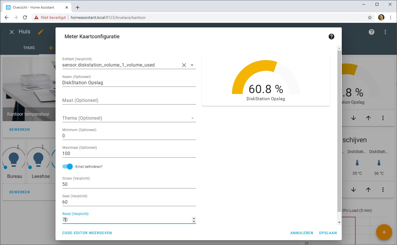 Om gegevens van een Synology-nas op te nemen in je dashboard kun je onder Instellingen / Integraties bij Synology DSM op Configureer klikken. Hierna volstaat het om je gebruikersnaam en wachtwoord op te geven. Handig aan de integratie is dat je bijvoorbeeld zicht kunt houden op de gebruikte opslagruimte en de status van de harde schijven. We voegen daarvoor om te beginnen een kaart Meter toe en selecteren de sensor met het percentage gebruikte opslagruimte. Het is handig enkele drempelwaardes op te geven, door een vinkje bij Ernst definiëren te zetten. Je kunt dan kiezen bij welke waarde de grafiek groen, geel of rood wordt, zodat je het direct ziet als de opslagruimte kritiek wordt. Om de temperatuur of status van de vier harde schijven te monitoren kun je een kaart Oogopslag of Entiteiten toevoegen. Bij deze kaarten kun je meerdere entiteiten toevoegen zoals sensors maar bijvoorbeeld ook lampen en schakelaars. Bij Oogopslag staan ze naast elkaar, Entiteit maakt een verticaal lijstje met de gekozen entiteiten. Beide kaarten zijn geschikt om de temperaturen of de status van de vier harde schijven te laten zien. Hierna zou je bijvoorbeeld ook een kaart van het type Geschiedenis grafiek toe kunnen voegen met de gemeten belasting van de nas.