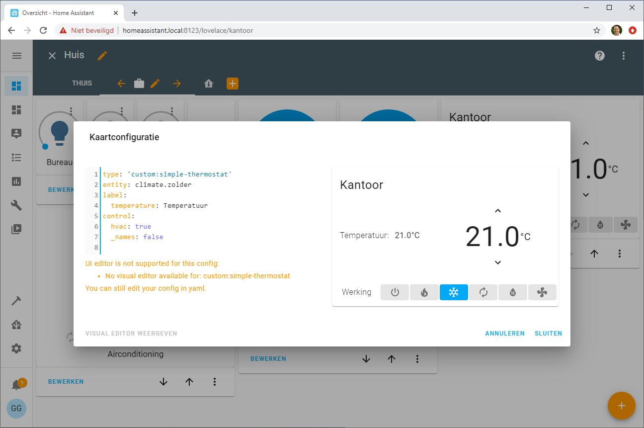 Het toevoegen van een airconditioning van Daikin is eenvoudig als je een model met wifi hebt. In het integratiescherm vind je hem dan meteen terug. Qua gebruik in Home Assistant is er weinig verschil met een slimme thermostaat: ze worden als klimaatregeling gezien. De standaard kaart heet Thermostaat. Het volstaat om hierin de bewuste airconditioning te kiezen en een naam in te voeren. En je hoeft je niet tot standaard kaarten te beperken. In de community zijn veel zogenoemde custom kaarten te vinden. Bijvoorbeeld simple-thermostat met een naar ons idee fijnere temperatuurregeling. Om deze te kunnen gebruiken voegen we een bron toe voor Lovelace (zie kader ‘Bronnen toevoegen voor Lovelace’): het bestand simple-thermostat.js uit de laatste release. Daarna ga je naar je dashboard, klik je op het plusteken en kies je Handmatig. Voor deze kaart is geen visuele editor beschikbaar, maar je hoeft in de code-editor maar een paar regels in te voeren: