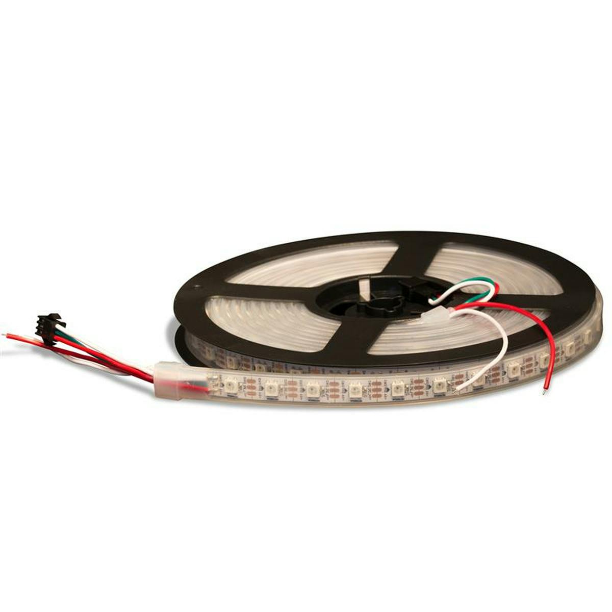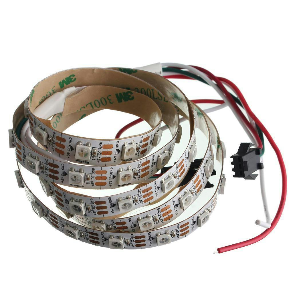 Op een ledstrip zijn de componenten, die we pixels noemen, achter elkaar geplaatst, meestal met 30 of 60 per meter. Voor elke component kan de kleur (rgb) en helderheid afzonderlijk worden geregeld. De strip werkt op 5 volt. Je kunt er meerdere achter elkaar gebruiken, maar zeker bij hoge dichtheid van de leds en bij langere lengtes moet je de spanningsvoorziening goed in de gaten houden, waarover later meer.
