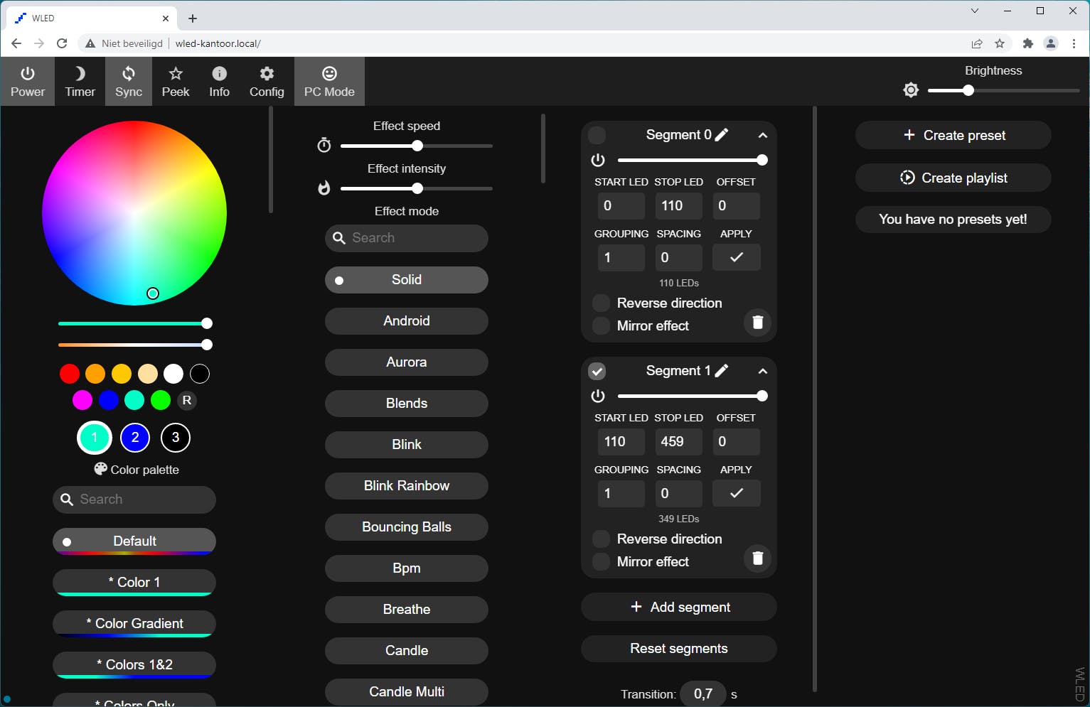 Onder Colors kun je een kleur of patroon kiezen en onder Effects een van de meer dan honderd effecten. Interessant is ook dat je onder Segments verschillende segmenten kunt maken die je dan een aparte kleur of helderheid kunt geven. Voor het instellen daarvan is het handig om naar PC Mode te gaan.