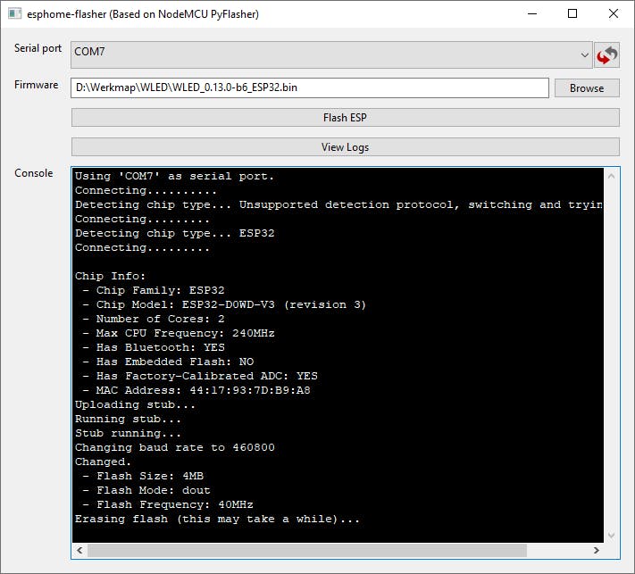 WLED is een heel populaire optie voor zelfbouw-ledstrips. De software werkt in combinatie met een ESP32-module beter en flexibeler dan de meeste specifieke ledcontrollers. Je kunt de software eenvoudig flashen op de microcontroller. Het ontwikkelbordje sluit je daarbij alléén aan op de pc (direct via usb) en dus niet op een voeding. Voor het flashen gebruiken we de ESPHome Flasher voor Windows. Slechts in een enkel geval zul je de usb-naar-UART-drivers hoeven te installeren. De bewuste tool zal de COM-poort van de ESP32-module als het goed is herkennen, waarna je het image voor WLED kunt flashen. Het image kun je downloaden via https://github.com/Aircoookie/WLED/releases. Kies de meest recente ESP32.bin-uitvoering. Raadpleeg eventueel de instructies op de website van WLED als het niet lukt.