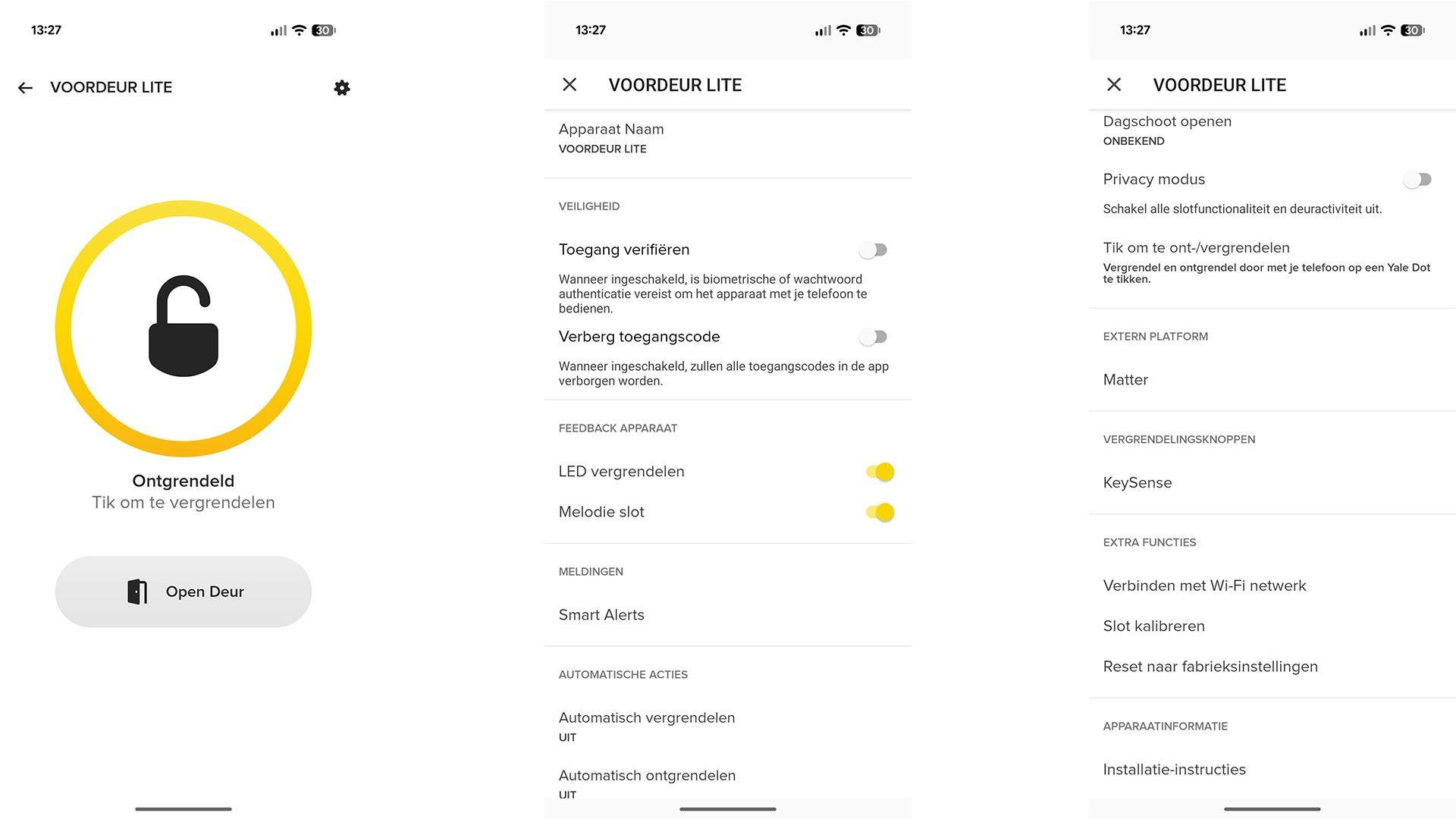 In de app vind je een reeks functies die het dagelijks gebruik net wat slimmer maken. Zo kun je eenvoudig tijdelijke digitale sleutels aanmaken voor gasten, de plantenwatergever, huishoudelijke hulp, familie of zelfs de postbode — en die toegang net zo makkelijk weer intrekken. In één oogopslag zie je bovendien wie het slot wanneer heeft bediend. Ook automatisch ontgrendelen zodra je aan komt lopen behoort tot de mogelijkheden. Wat hier wel ontbreekt, is DoorSense: de functie die laat zien of de deur daadwerkelijk open of dicht is.