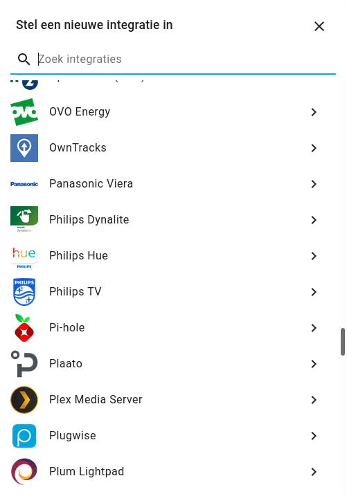 Zelfs als je geen apparaten hebt toegevoegd, zie je op een Raspberry Pi altijd minstens twee integraties: Meteorologisk institutt (Met.no) voor het weerbericht en de Raspberry Pi Voeding Checker. Klik je onderaan rechts op de blauwe knop Integratie toevoegen, dan krijg je de keuze uit een lange lijst met integraties.