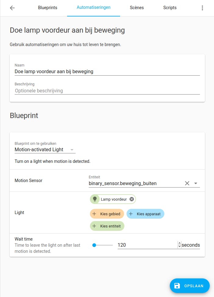 Enkele blueprints zijn standaard al geïnstalleerd in Home Assistant. Klik op Automatisering maken om op basis van de bijbehorende blueprint een automatisering te maken. Je hoeft dan enkel nog wat te configureren. Zo kies je bij de blueprint Motion-activated Light de entiteit van de bewegingssensor en het licht dat je daarvoor wilt laten activeren. Je kunt er ook instellen hoelang het licht nog aanblijft na de laatste beweging.