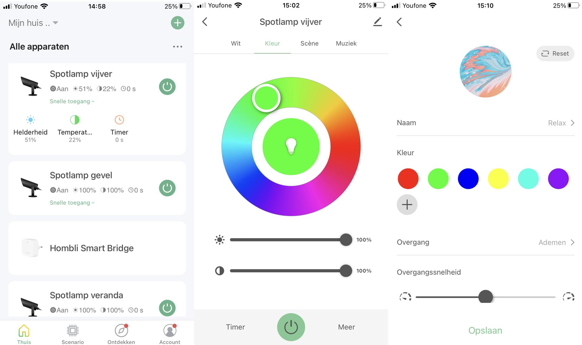 De bedoeling is dat je de spotlampen koppelt aan de Nederlandstalige Hombli-app (Android/iOS). Dat kan rechtstreeks via bluetooth. De reikwijdte voor de bediening vanaf een smartphone is ongeveer tien meter. Een alternatieve methode is om de tuinlampen met de los verkrijgbare Hombli Smart Bluetooth Bridge te verbinden. Dit apparaatje heeft een adviesprijs van 44,95 euro en voegt meer functies aan de Smart Spot Light Starter Kit toe. Zo kun je de verlichting hiermee vanaf elke plek bedienen. Dankzij Google Assistent-integratie zet je de lampen desgewenst met je stem aan en uit. Tot slot kun je ook tijdschema’s instellen, zodat je in feite niet meer naar de tuinlampen hoeft om te kijken.
