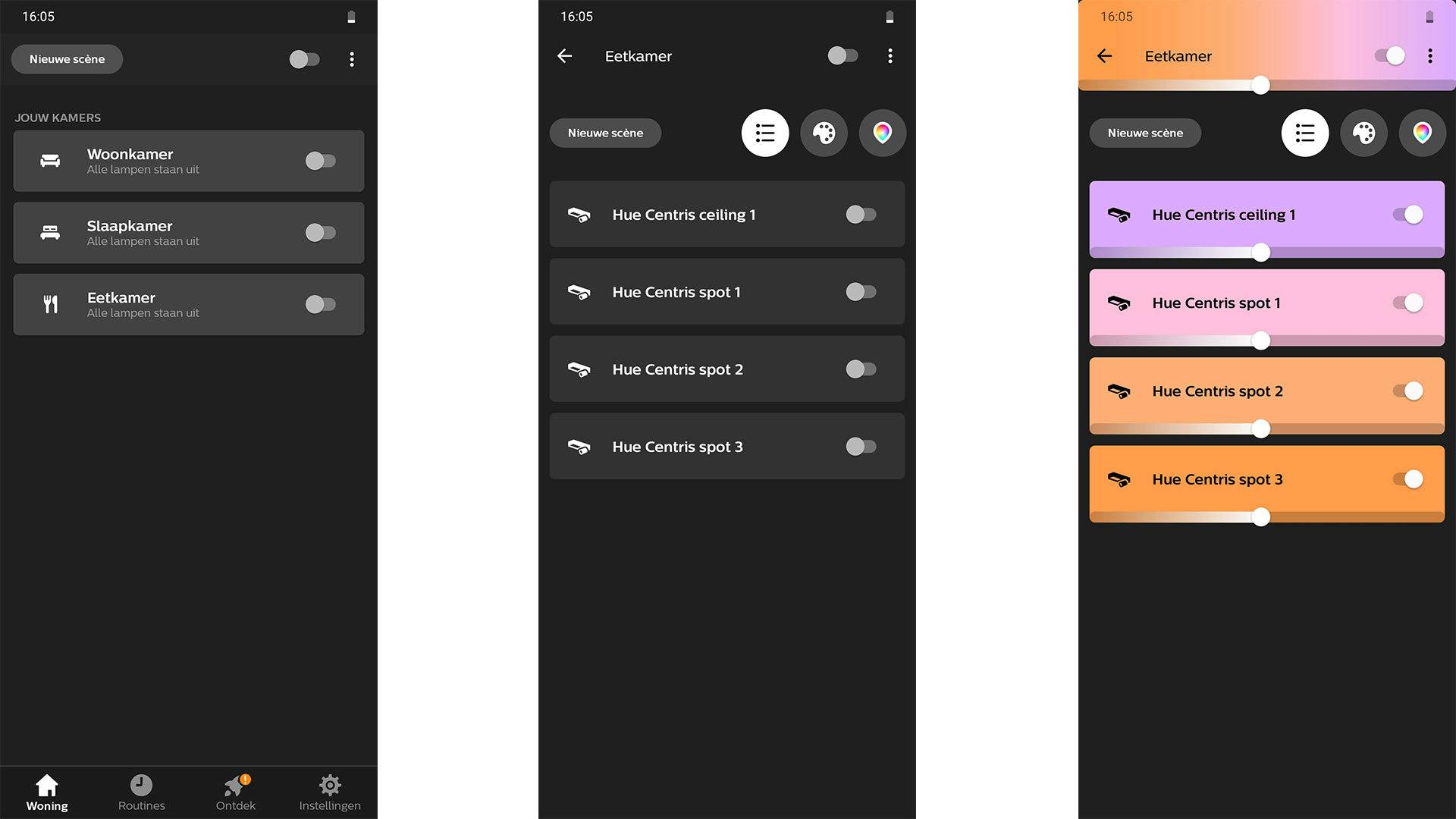Je bedient de Philips Hue Centris via de gratis Hue-app, beschikbaar voor Android en iOS. Na het toevallig van de lamp, wat overigens een zeer simpel proces is, krijg je er ineens vier lampen bij in je huis. De drie spotjes en de lichtbalk zijn namelijk losse lampen, ook al zitten ze in één ombouw. Daardoor is het mogelijk de lampen per stuk in te stellen, wat een tof idee is. Elke lamp kan een eigen helderheid, kleur of warmte hebben en dat biedt gewoonweg veel mogelijkheden.