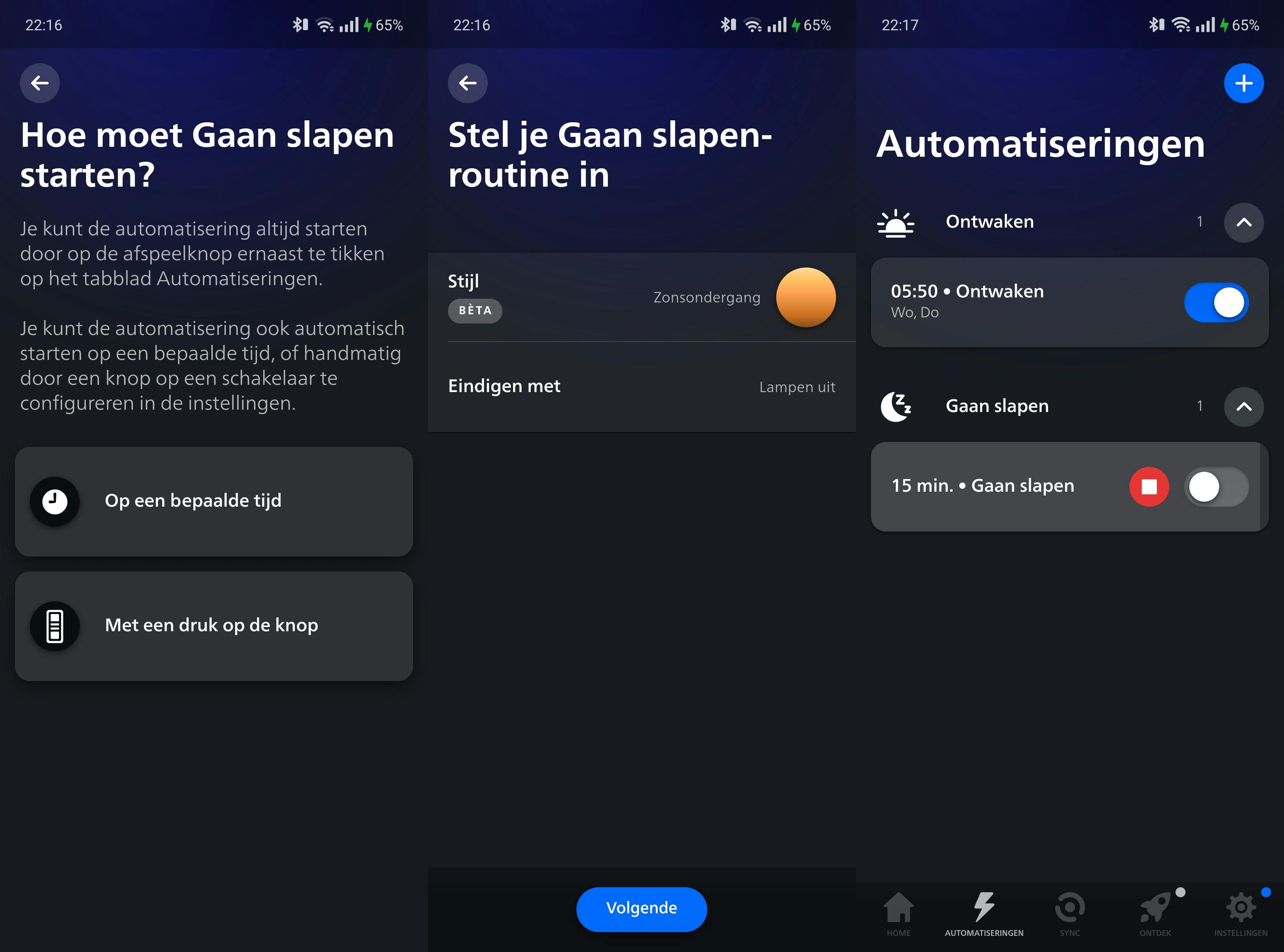 De knoppen zijn wel handig, want je kunt er allerlei acties aan verbinden. Standaard start een druk op de ene knop de slaaproutine, waarbij de lamp achterop en de leeslamp rustige kleuren tonen en die in vijftien minuten afbouwen tot een donkere ruimte. Met de andere knop kun je door te klikken wisselen tussen verschillende scènes, waaronder een energieke leesmodus of juist een subtiel leeslampje dat je partner niet stoort. Via de Philips Hue-app kun je zelf bepalen wat de twee knoppen doen, wat vooral prettig is als je meer Philips Hue-producten gebruikt.